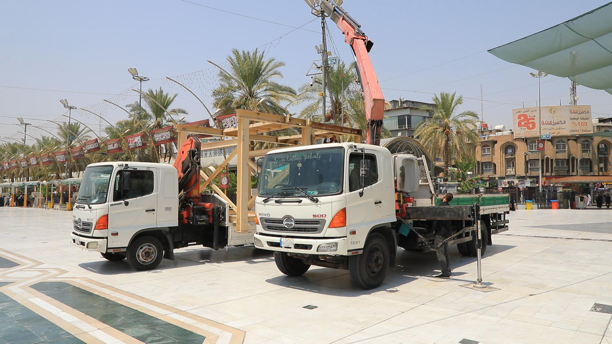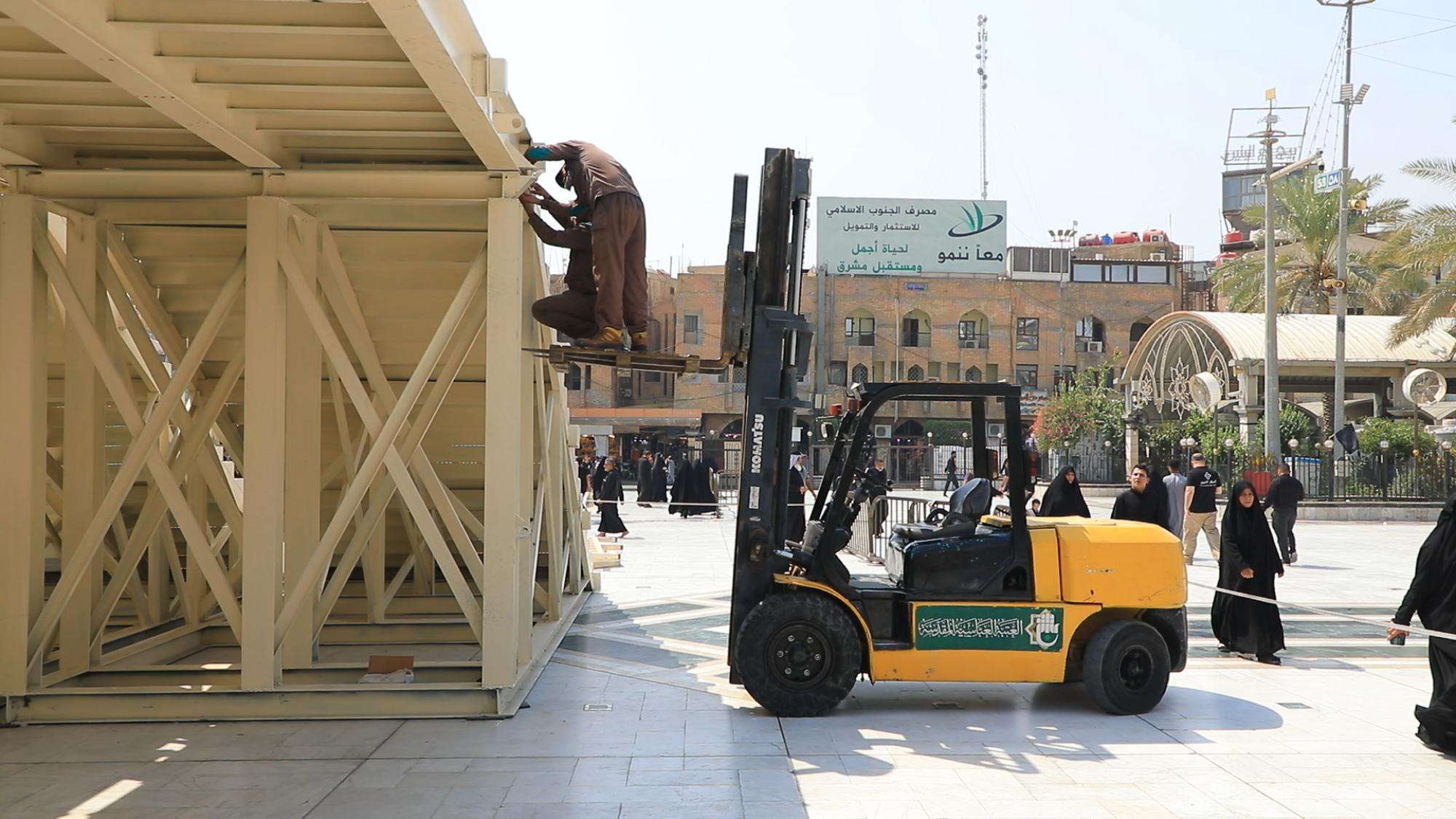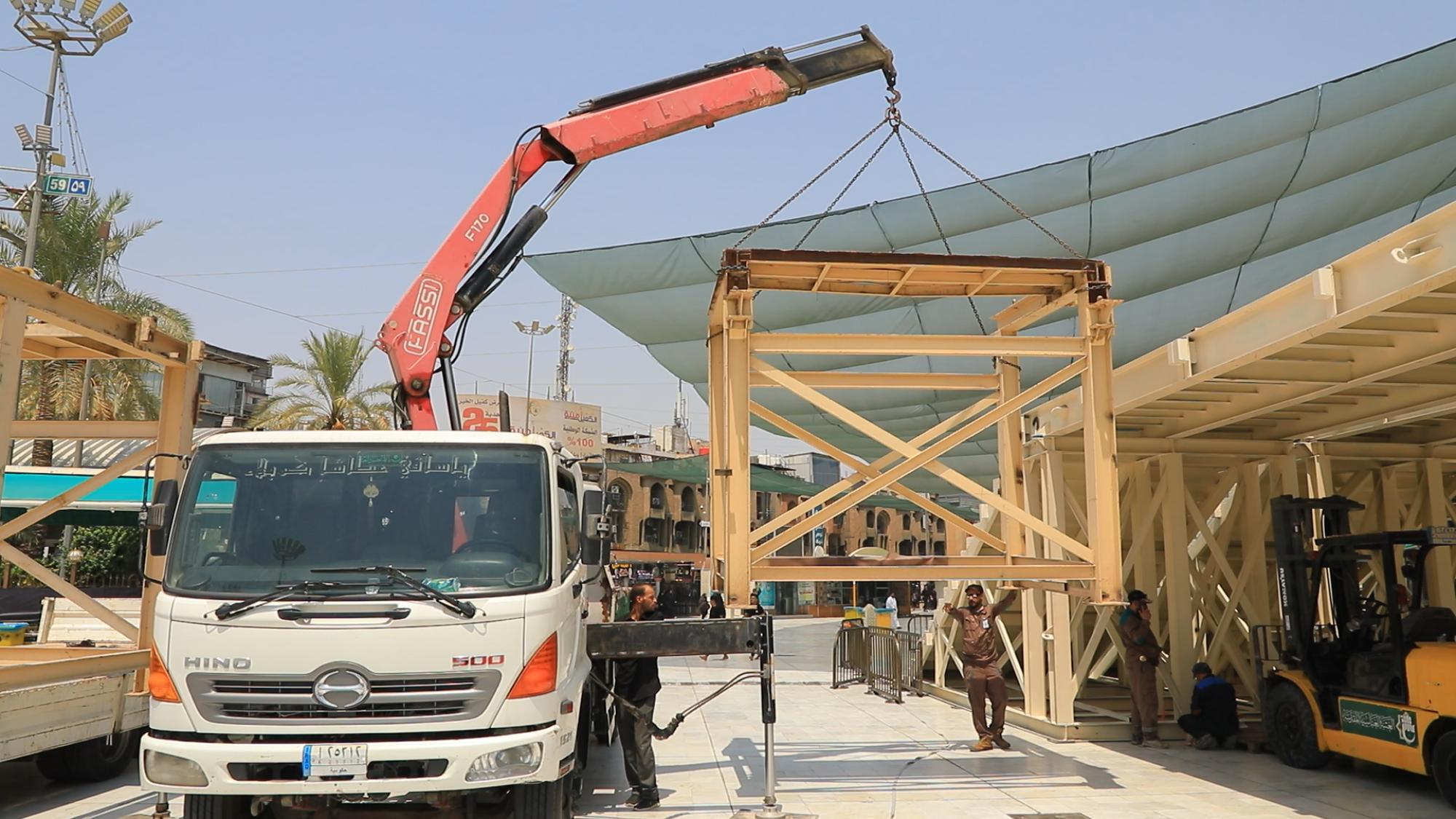He added, " the bridge is being erected from the side of the gate of Imam al-Hassan (peace be upon him) overlooking the square between the Two Holy Shrines, and this comes as part of the preparations for the Blessed Ziyarat Arba'een," pointing out that "the dimensions of the bridge were designed with a length of 21 meters and a width of 8 meters, divided into two halves, the first to go and the other to return, according to the required engineering measurements and under the supervision of specialized engineers."