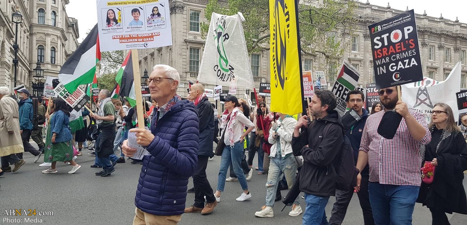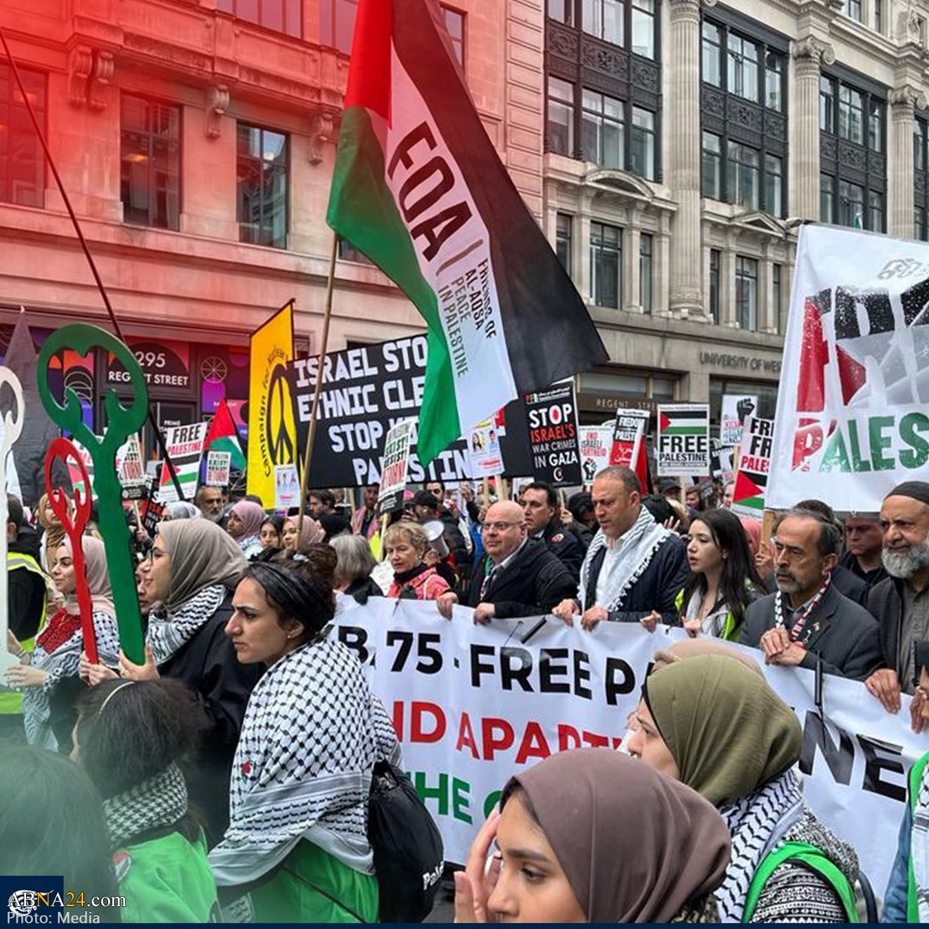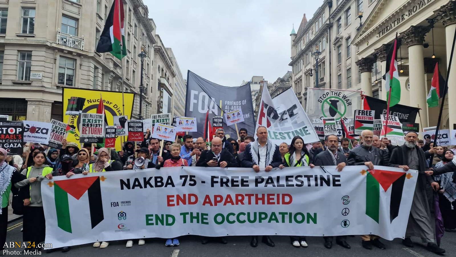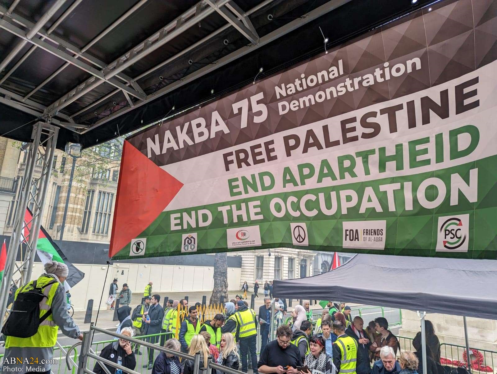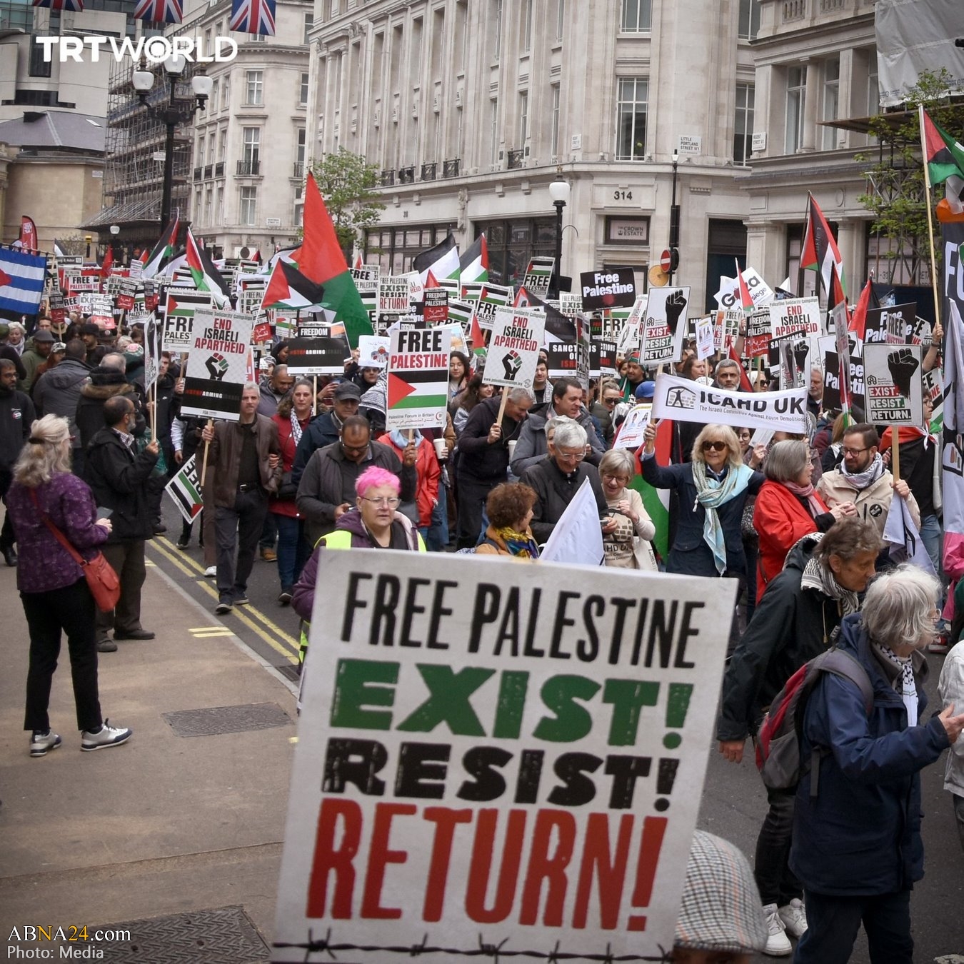 Pro-Palestine activists march to Downing Street in London to demand that the British government pressure ‘Israel’ to stop bombing Gaza and impose sanctions on ‘Israel’ for its 75-year Nakba of Palestine. Thousands of people gathered in London to mark the 75th anniversary of Nakba Day, which marks the establishment of the fake regime of Israel in historical Palestine, forcing nearly 800,000 Palestinians to flee their homes.