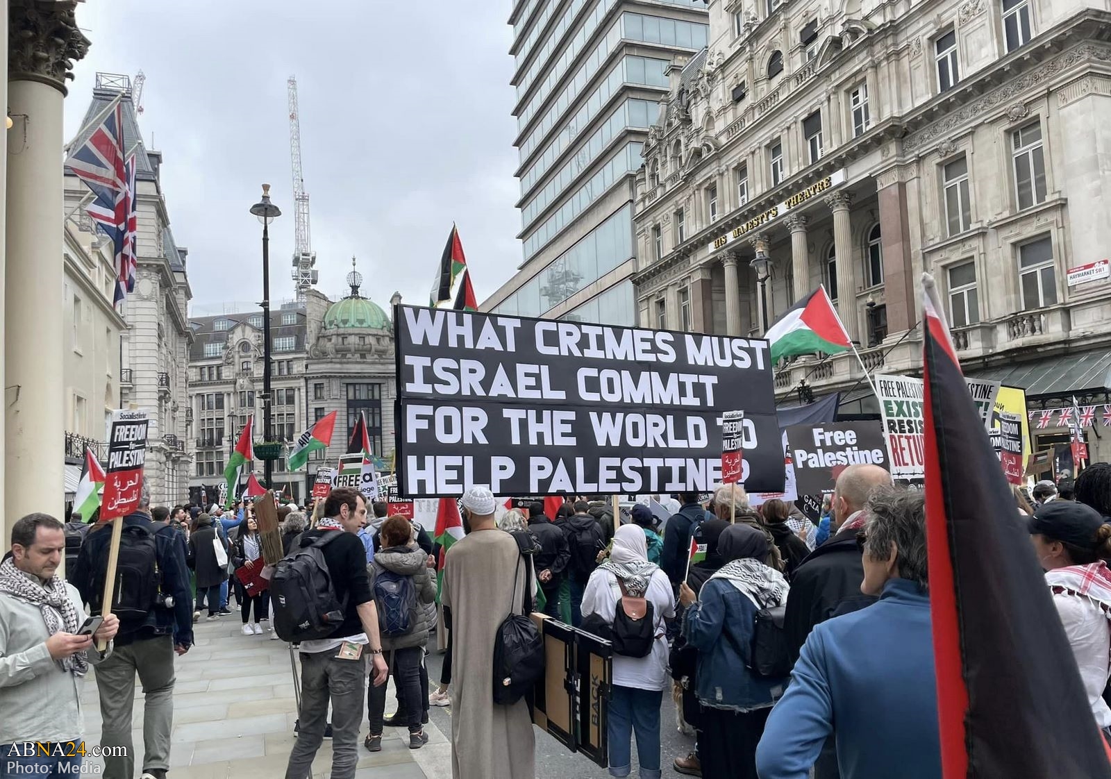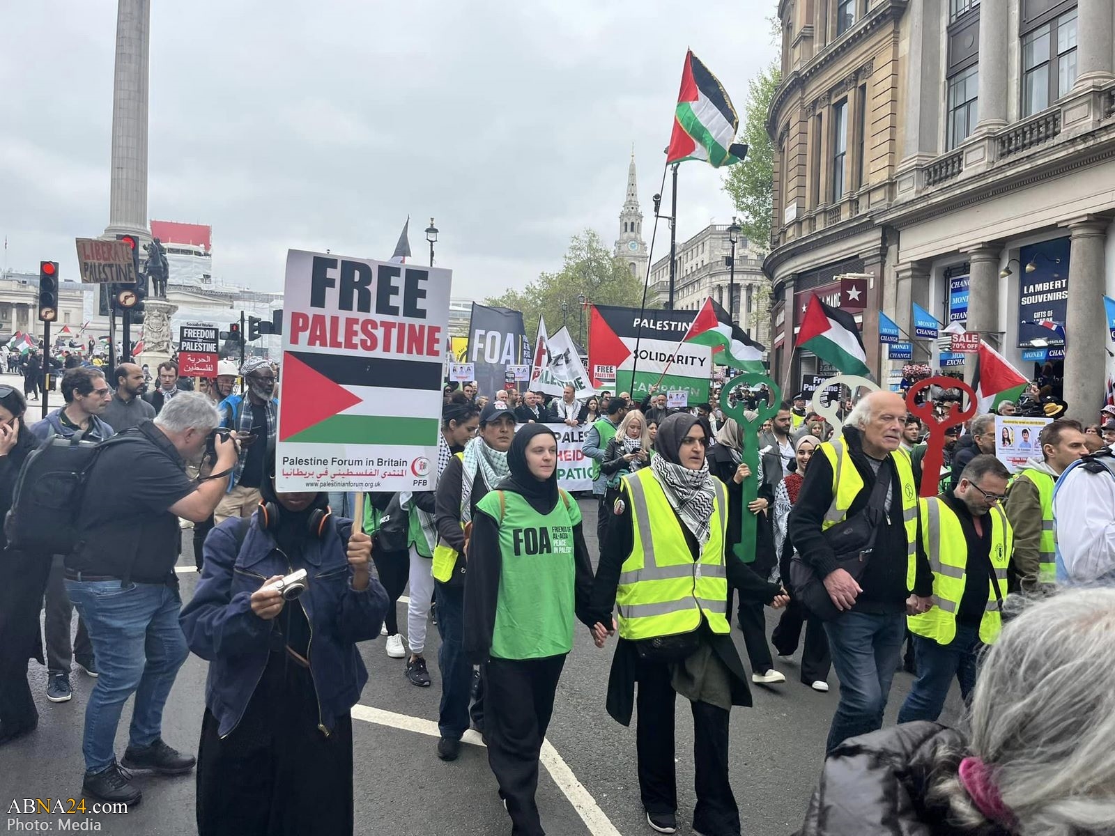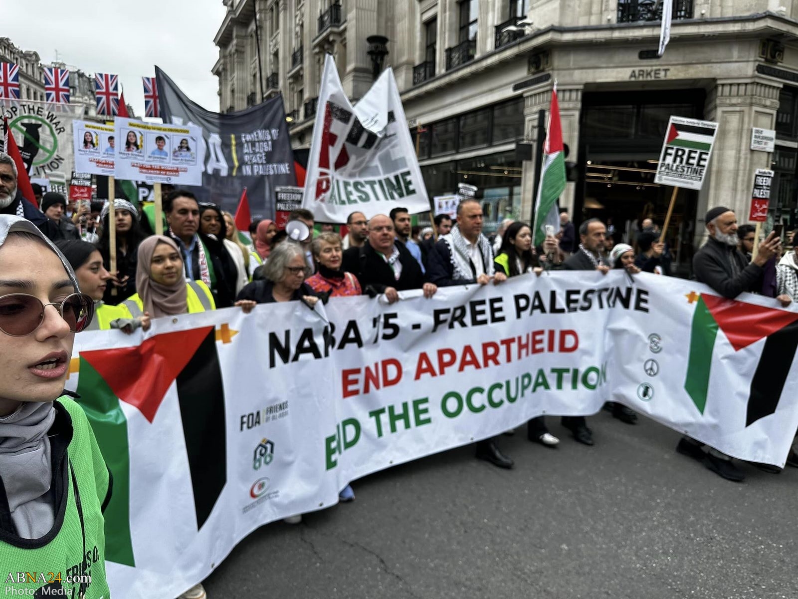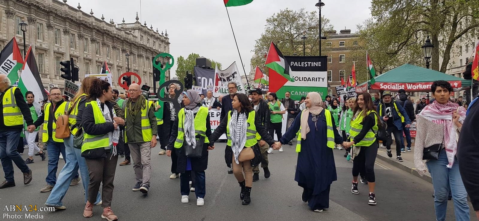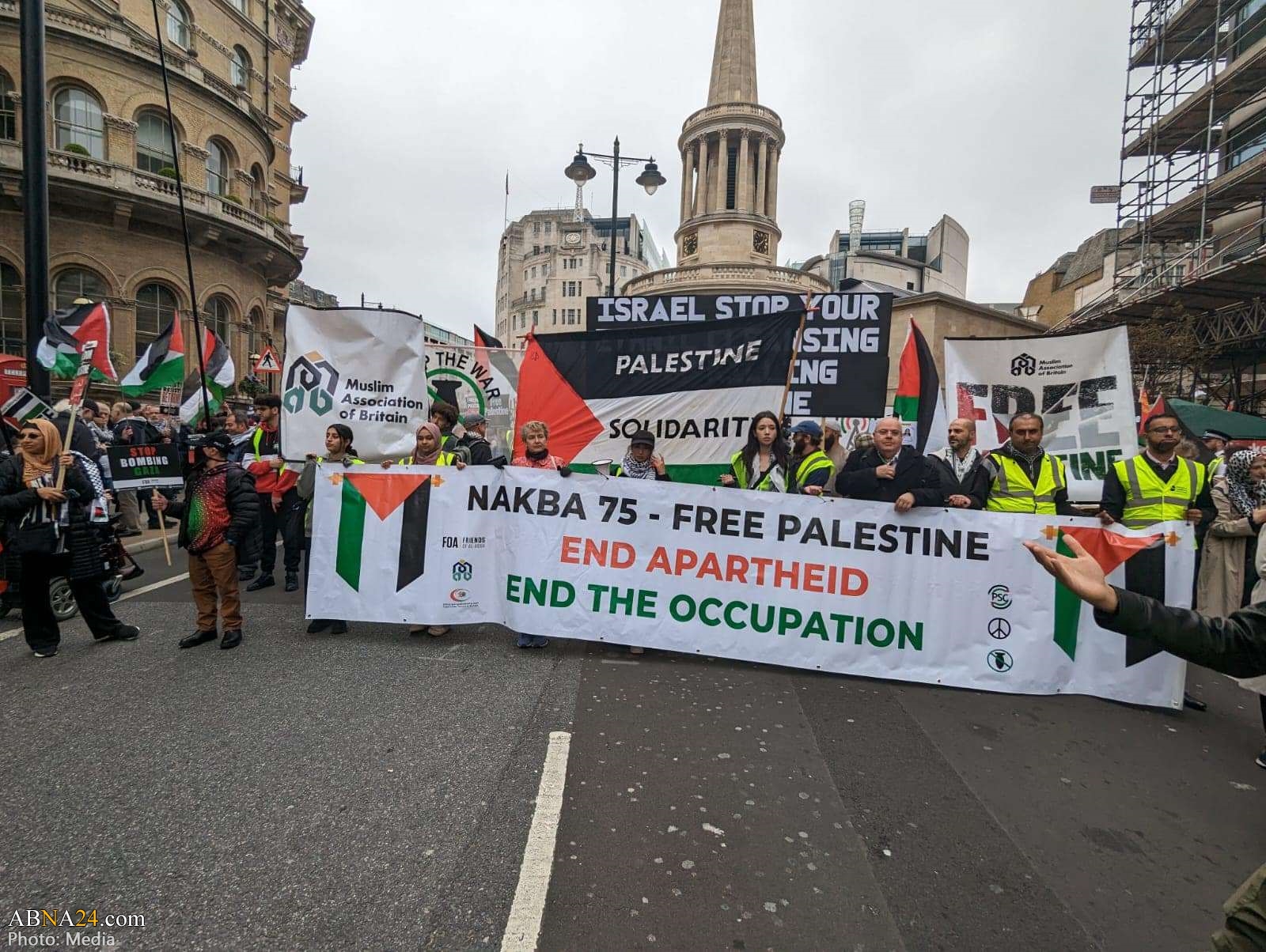 Pro-Palestine activists march to Downing Street in London to demand that the British government pressure ‘Israel’ to stop bombing Gaza and impose sanctions on ‘Israel’ for its 75-year Nakba of Palestine. Thousands of people gathered in London to mark the 75th anniversary of Nakba Day, which marks the establishment of the fake regime of Israel in historical Palestine, forcing nearly 800,000 Palestinians to flee their homes.