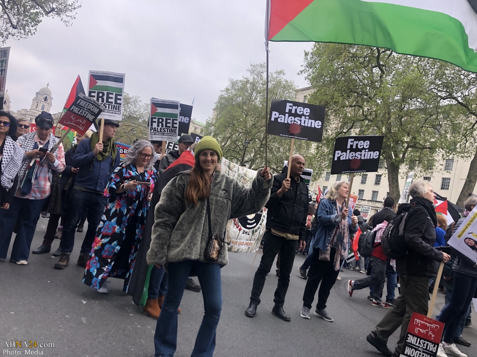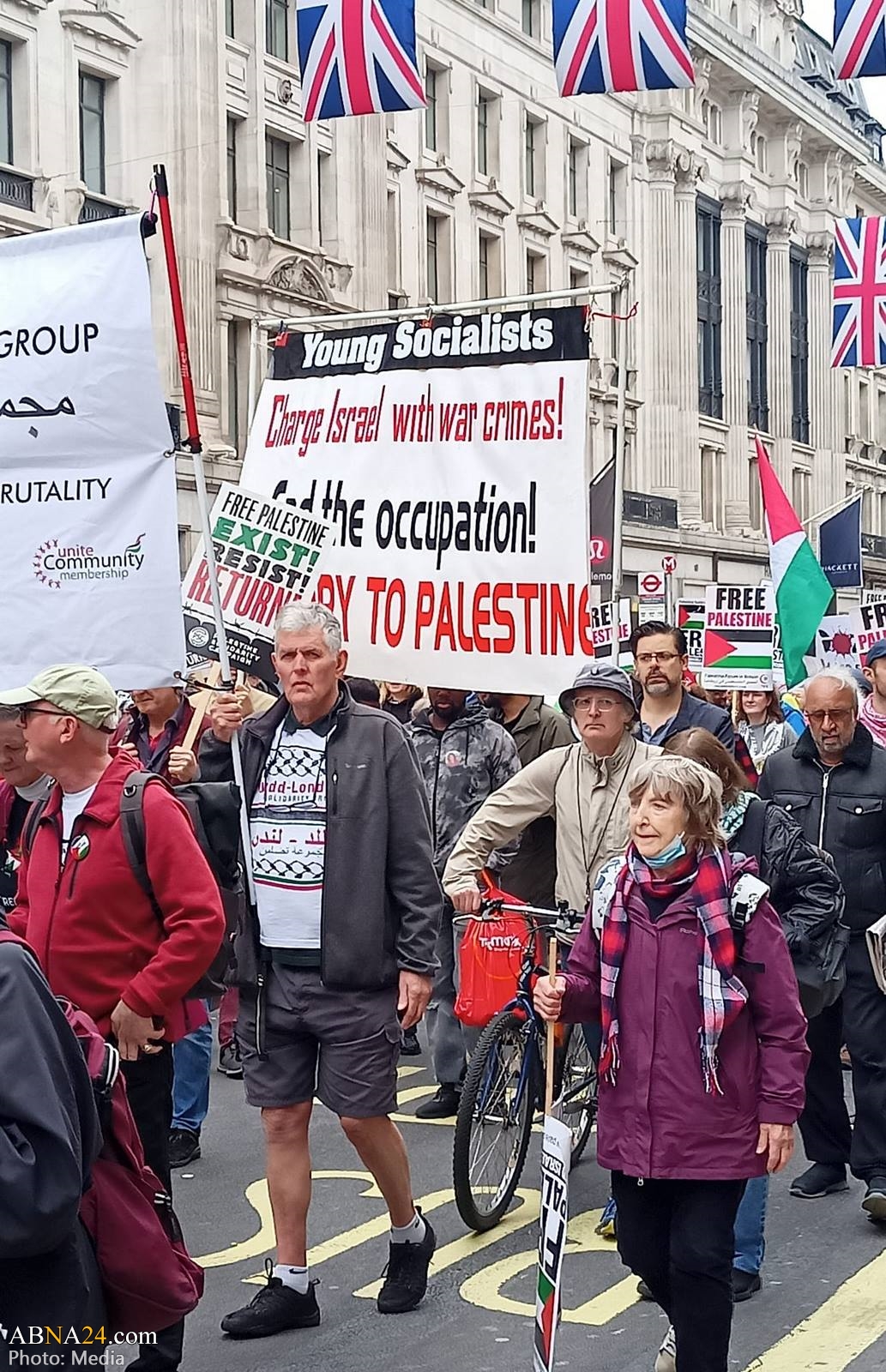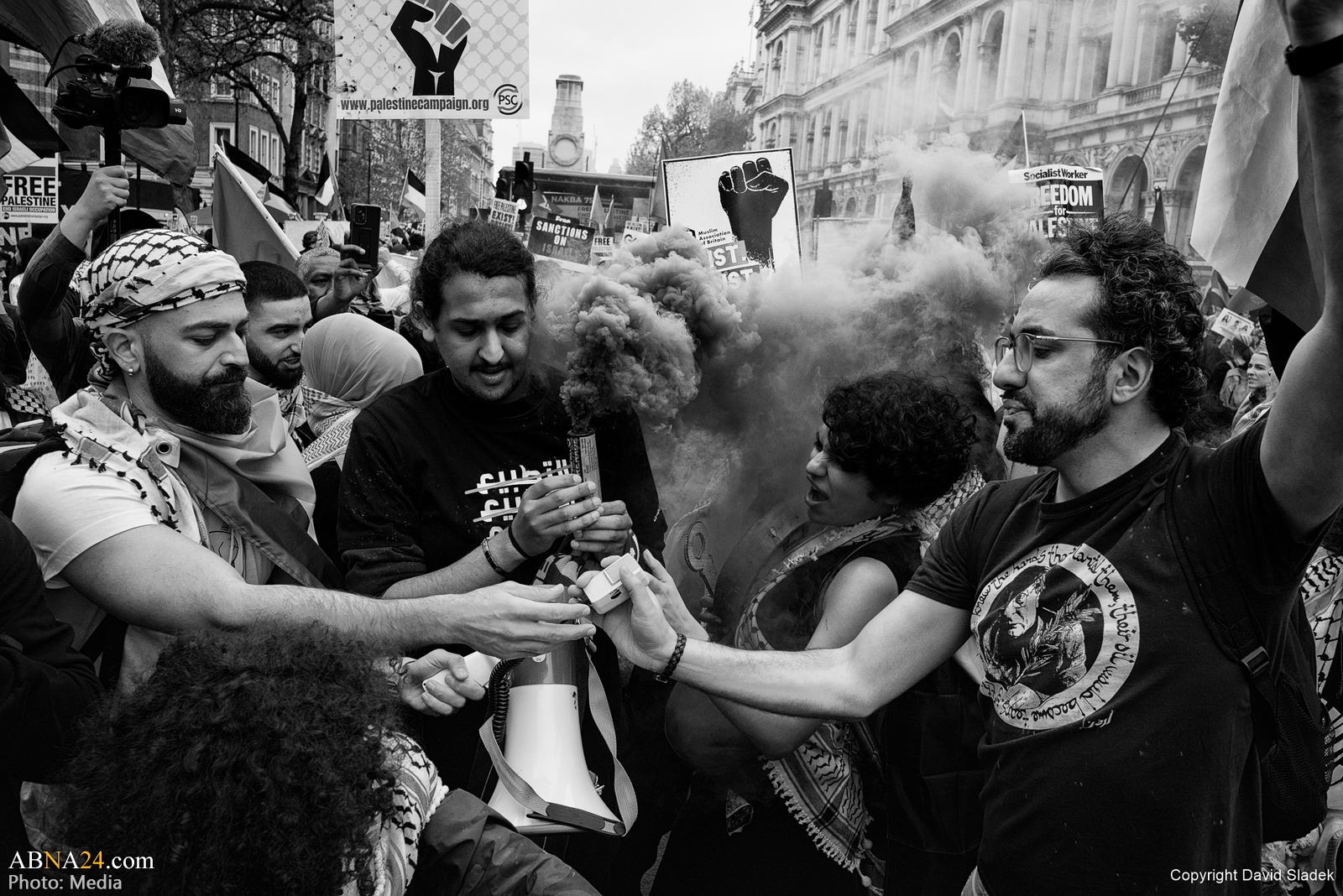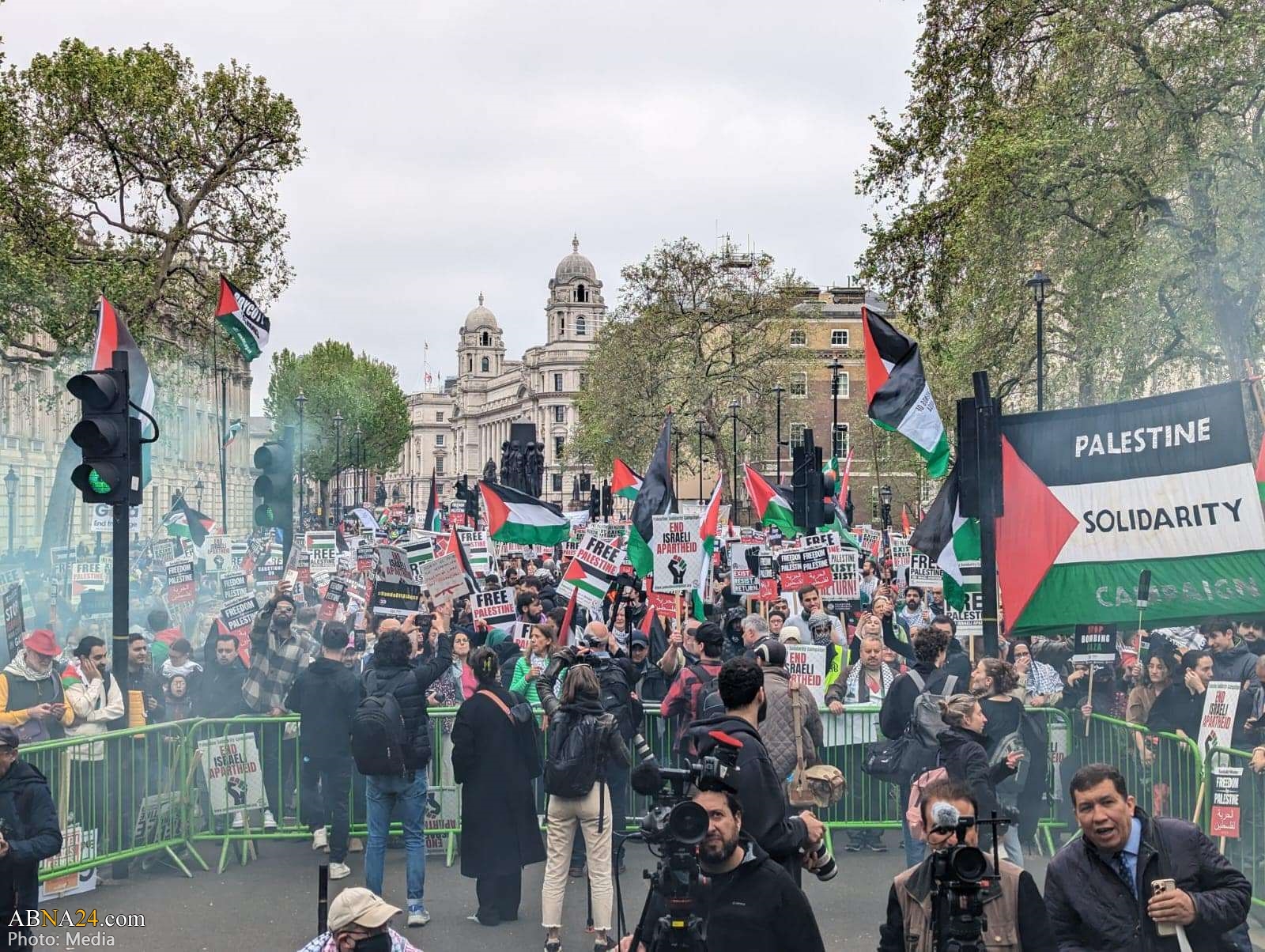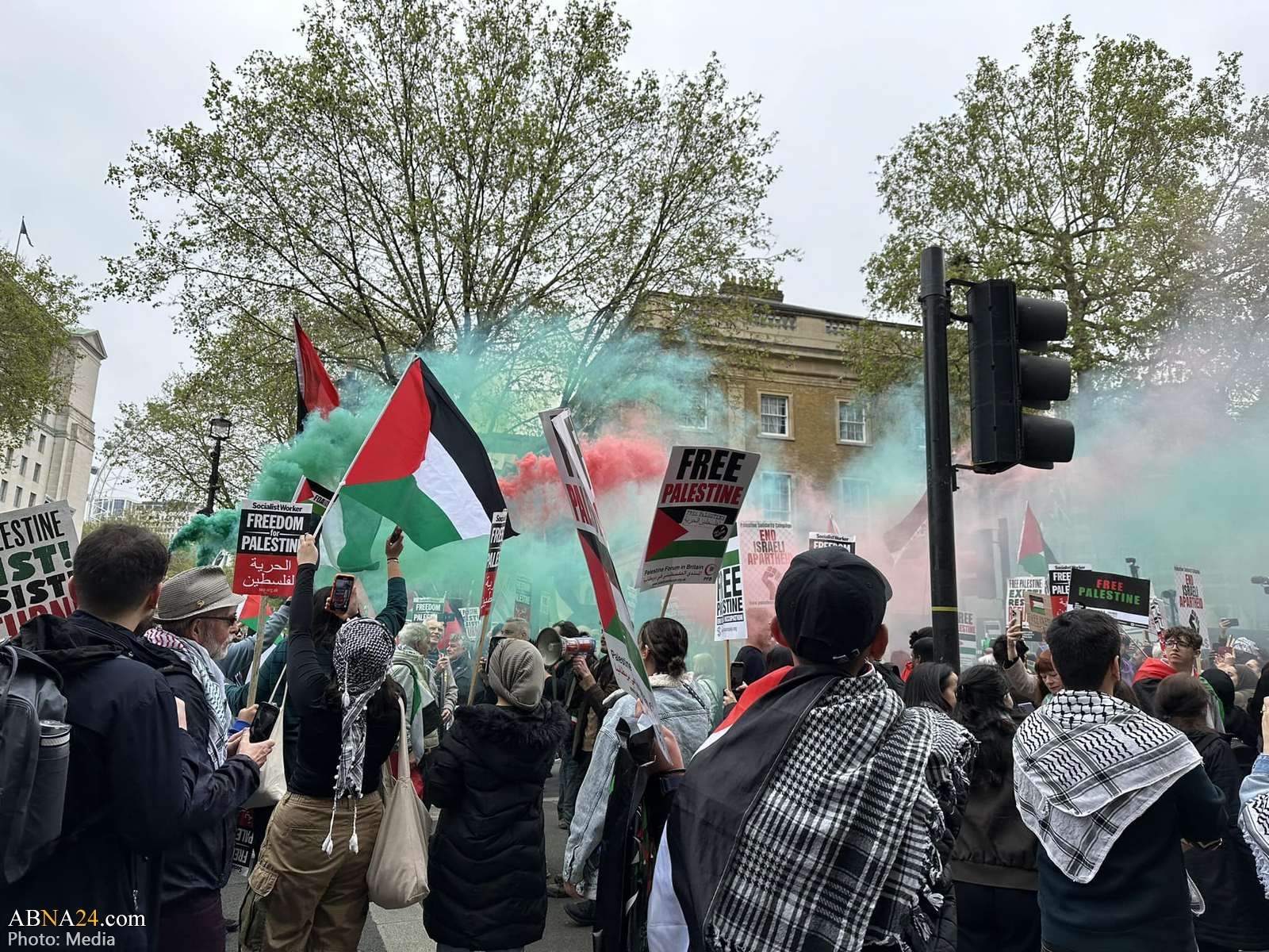 Pro-Palestine activists march to Downing Street in London to demand that the British government pressure ‘Israel’ to stop bombing Gaza and impose sanctions on ‘Israel’ for its 75-year Nakba of Palestine. Thousands of people gathered in London to mark the 75th anniversary of Nakba Day, which marks the establishment of the fake regime of Israel in historical Palestine, forcing nearly 800,000 Palestinians to flee their homes.