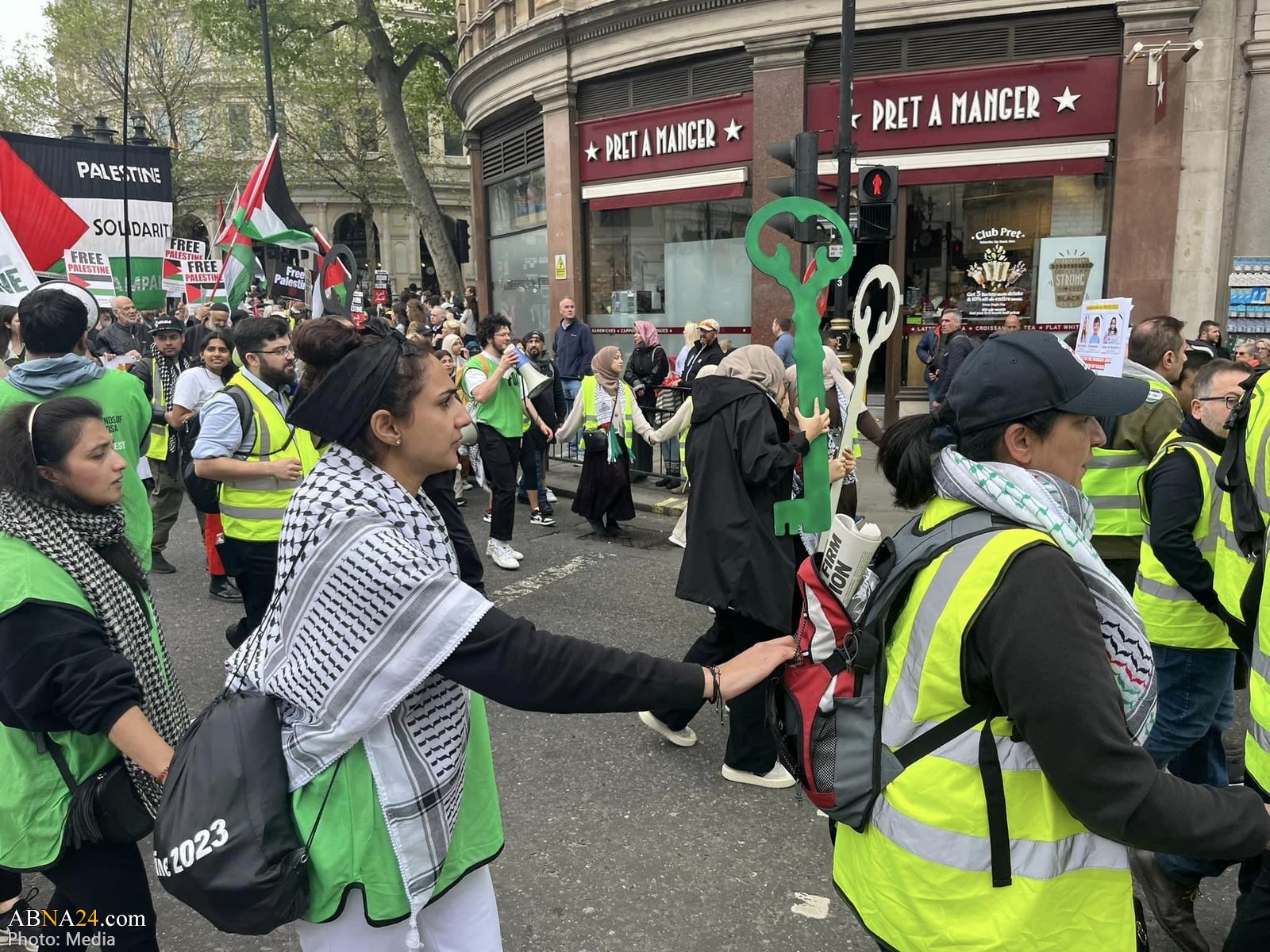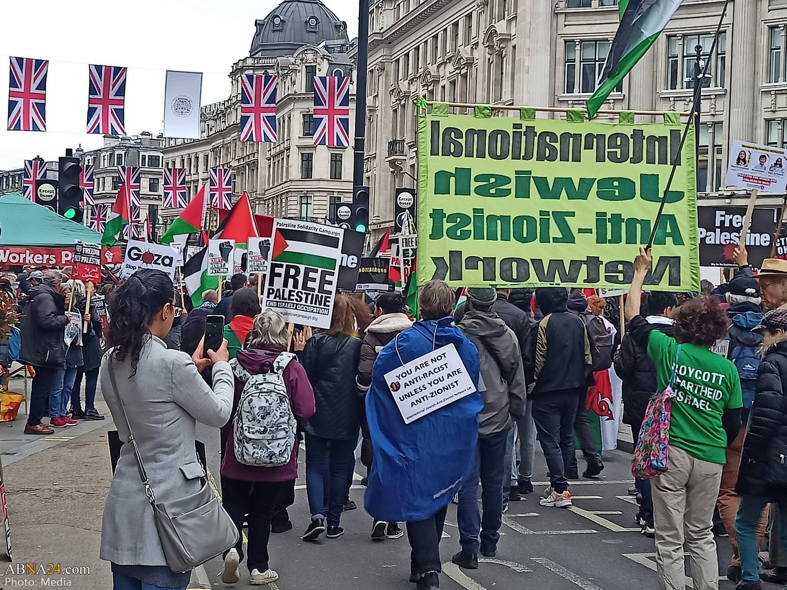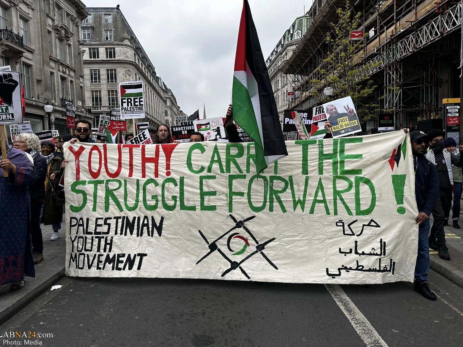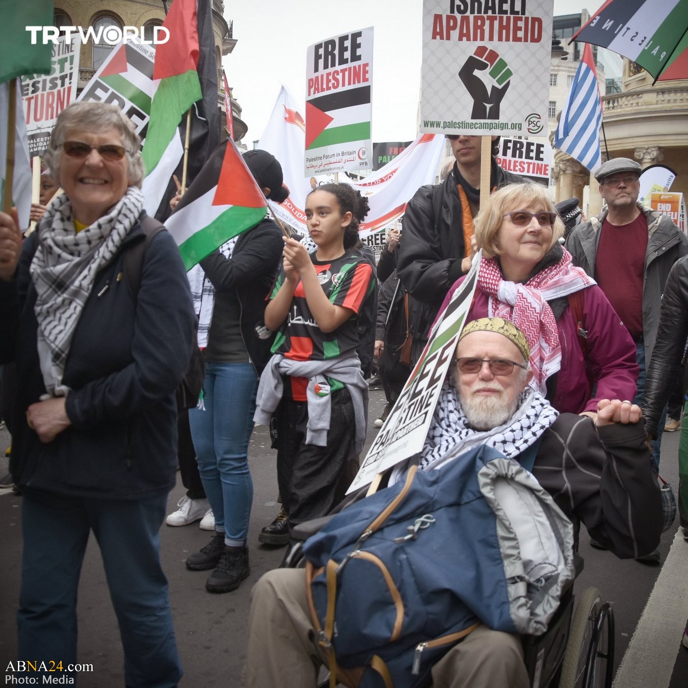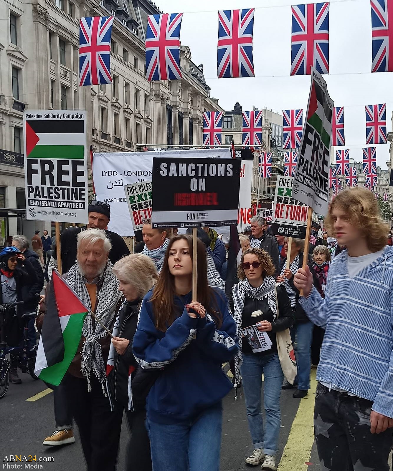 Pro-Palestine activists march to Downing Street in London to demand that the British government pressure ‘Israel’ to stop bombing Gaza and impose sanctions on ‘Israel’ for its 75-year Nakba of Palestine. Thousands of people gathered in London to mark the 75th anniversary of Nakba Day, which marks the establishment of the fake regime of Israel in historical Palestine, forcing nearly 800,000 Palestinians to flee their homes.