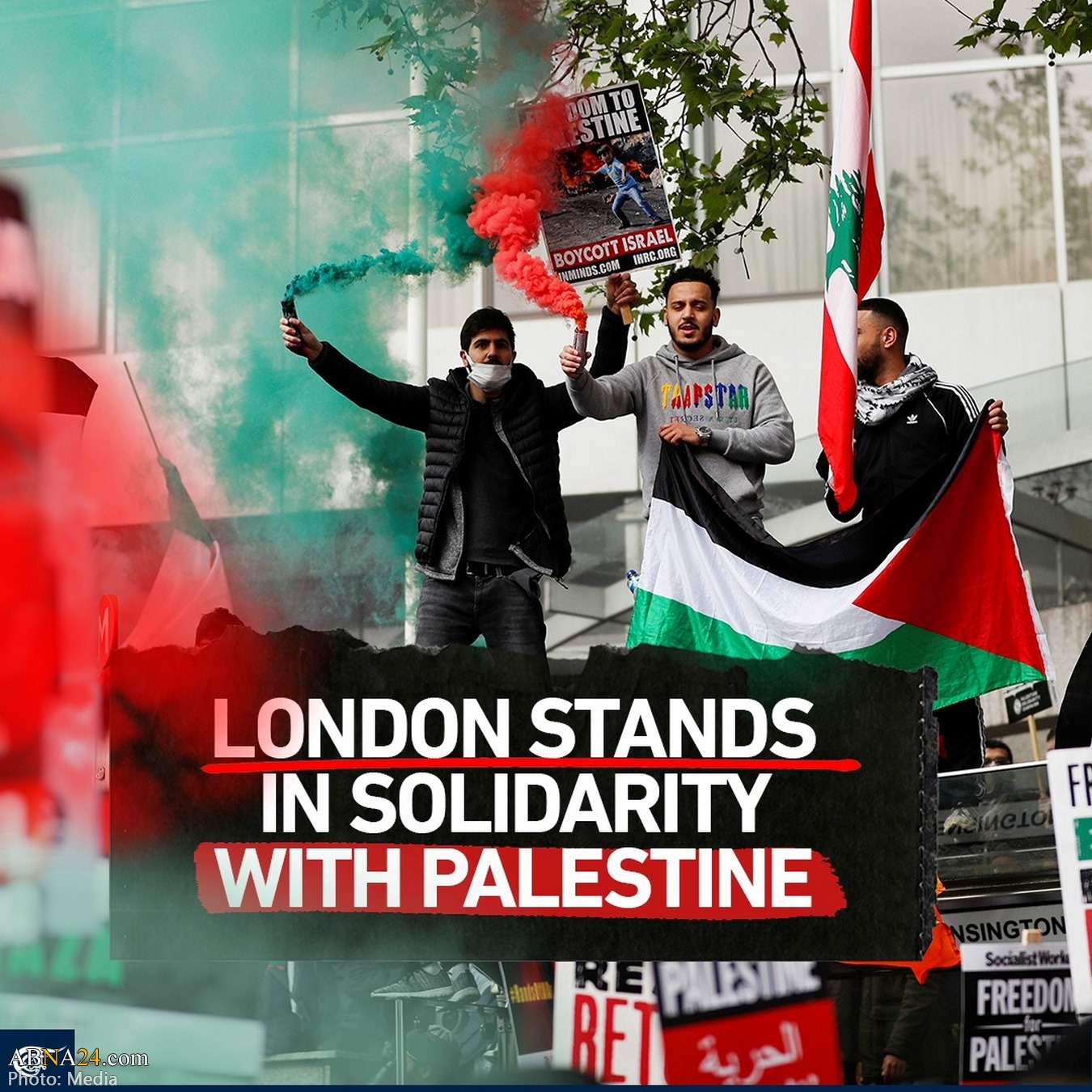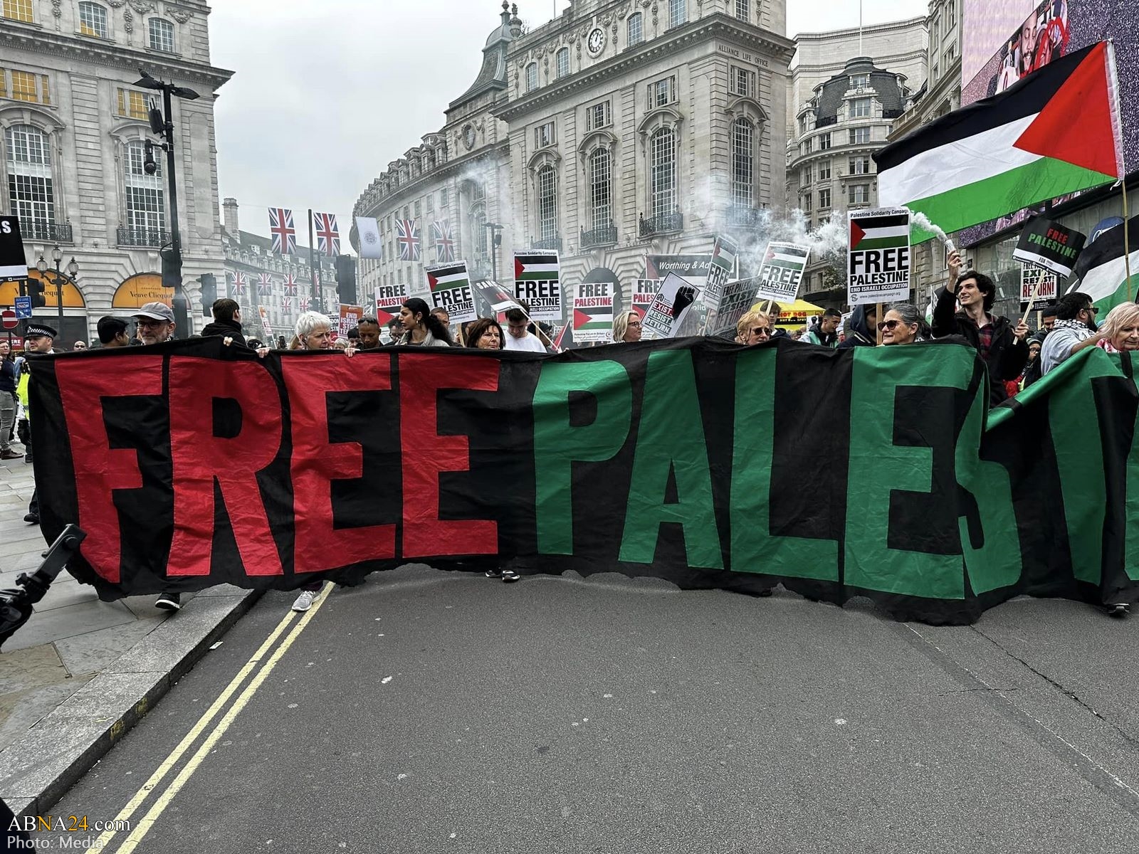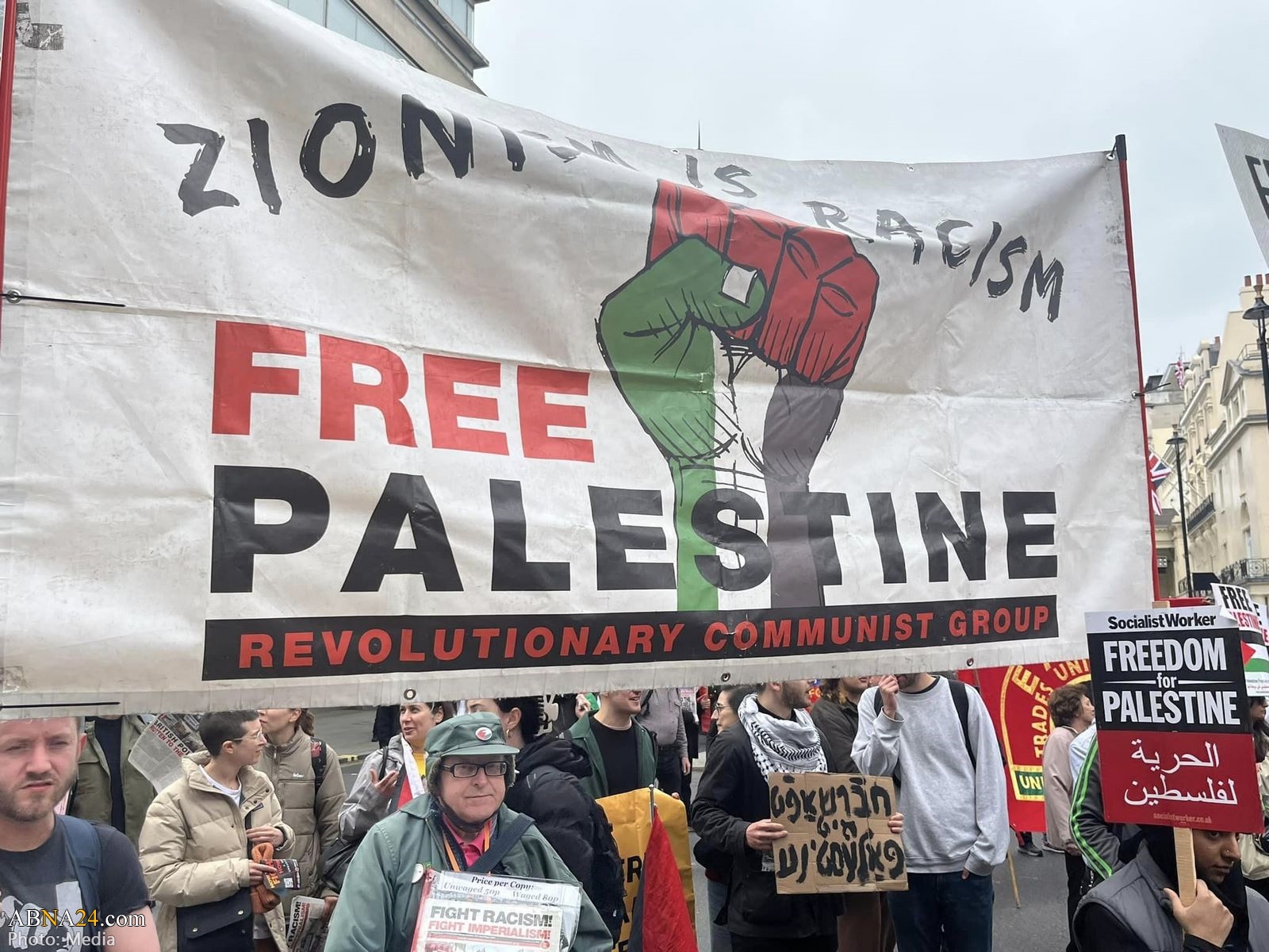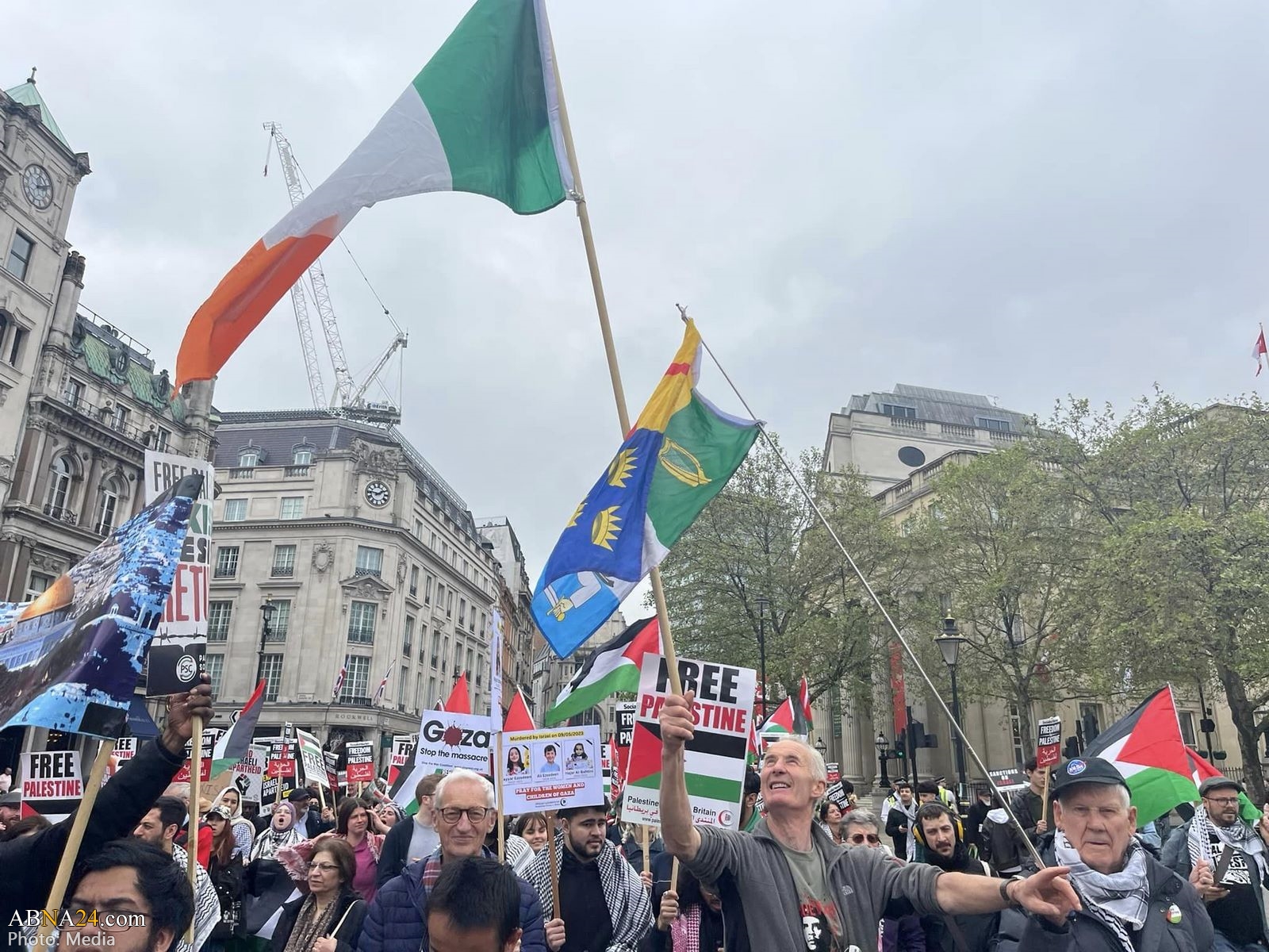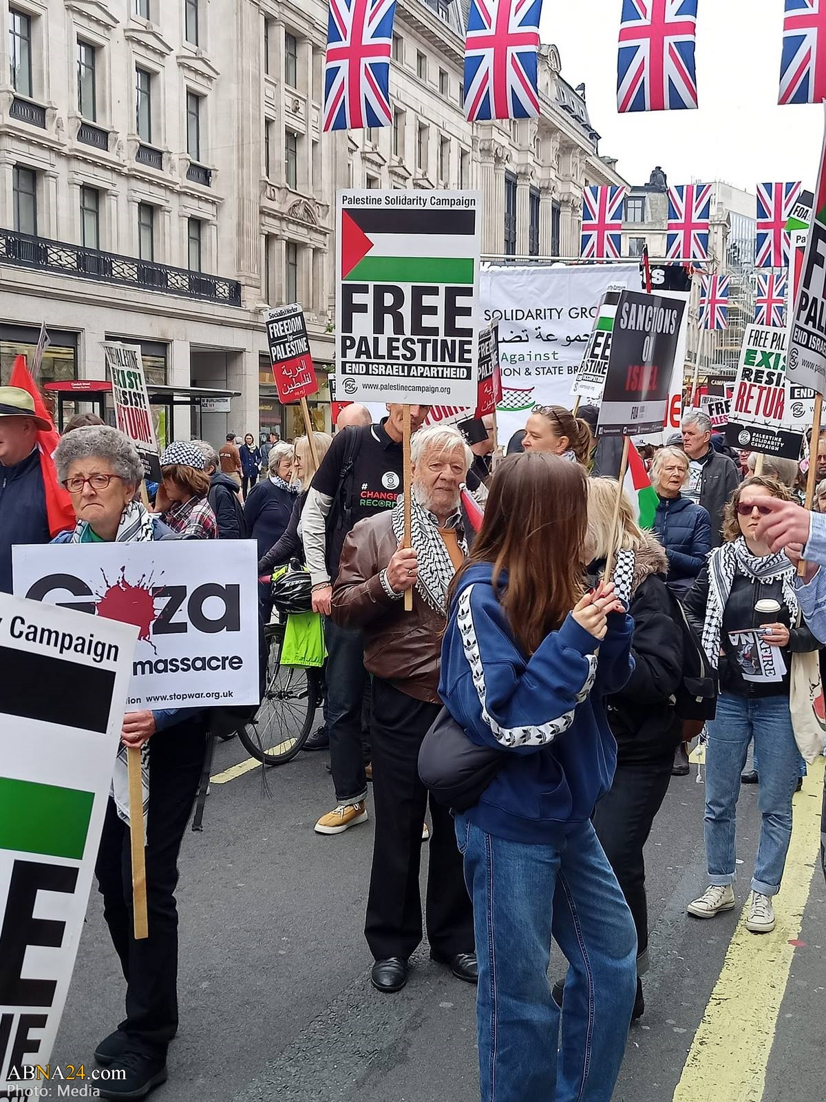 Pro-Palestine activists march to Downing Street in London to demand that the British government pressure ‘Israel’ to stop bombing Gaza and impose sanctions on ‘Israel’ for its 75-year Nakba of Palestine. Thousands of people gathered in London to mark the 75th anniversary of Nakba Day, which marks the establishment of the fake regime of Israel in historical Palestine, forcing nearly 800,000 Palestinians to flee their homes.
