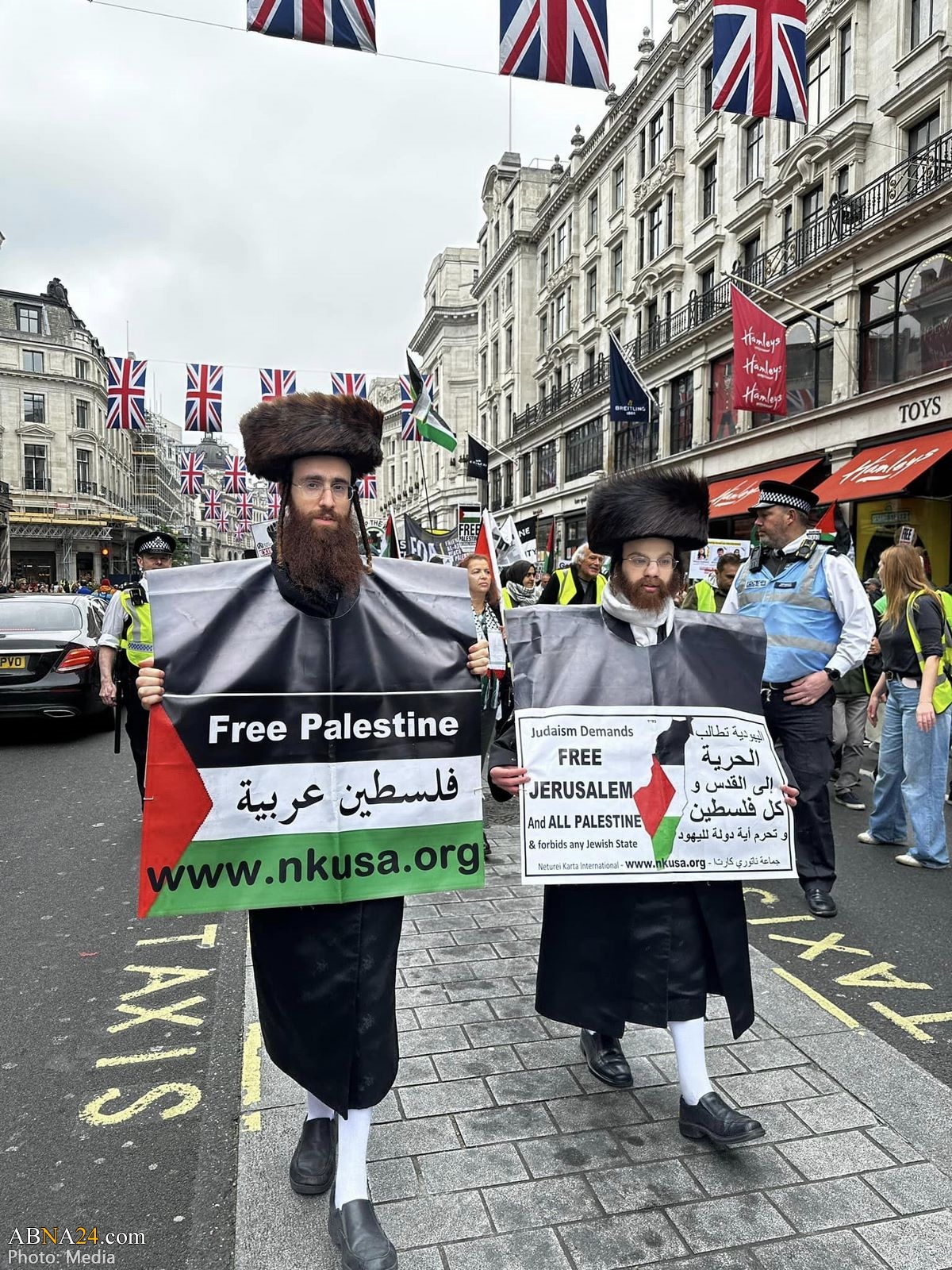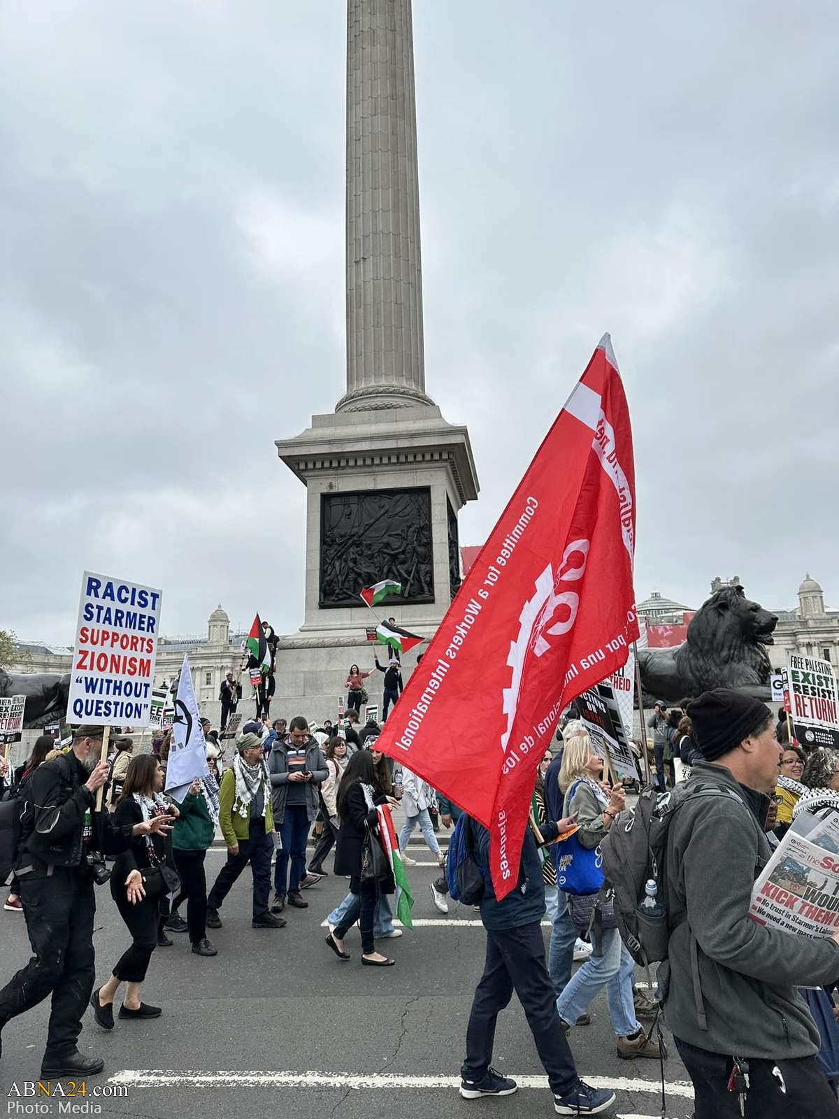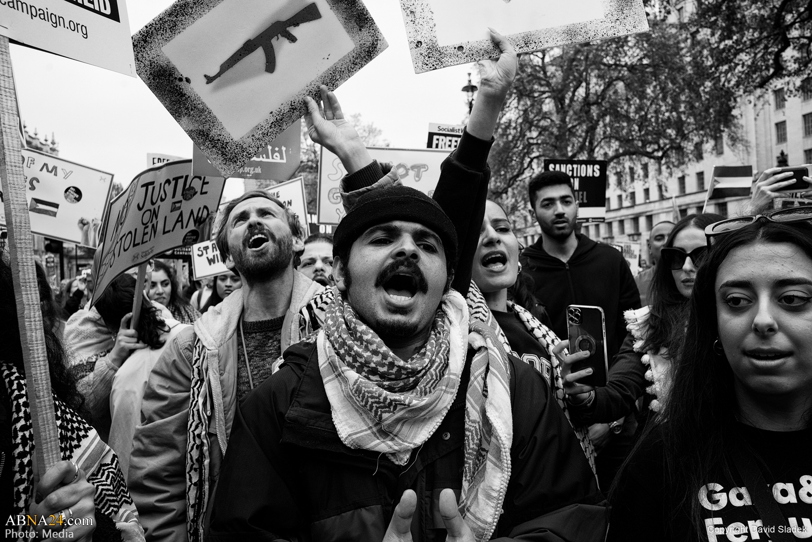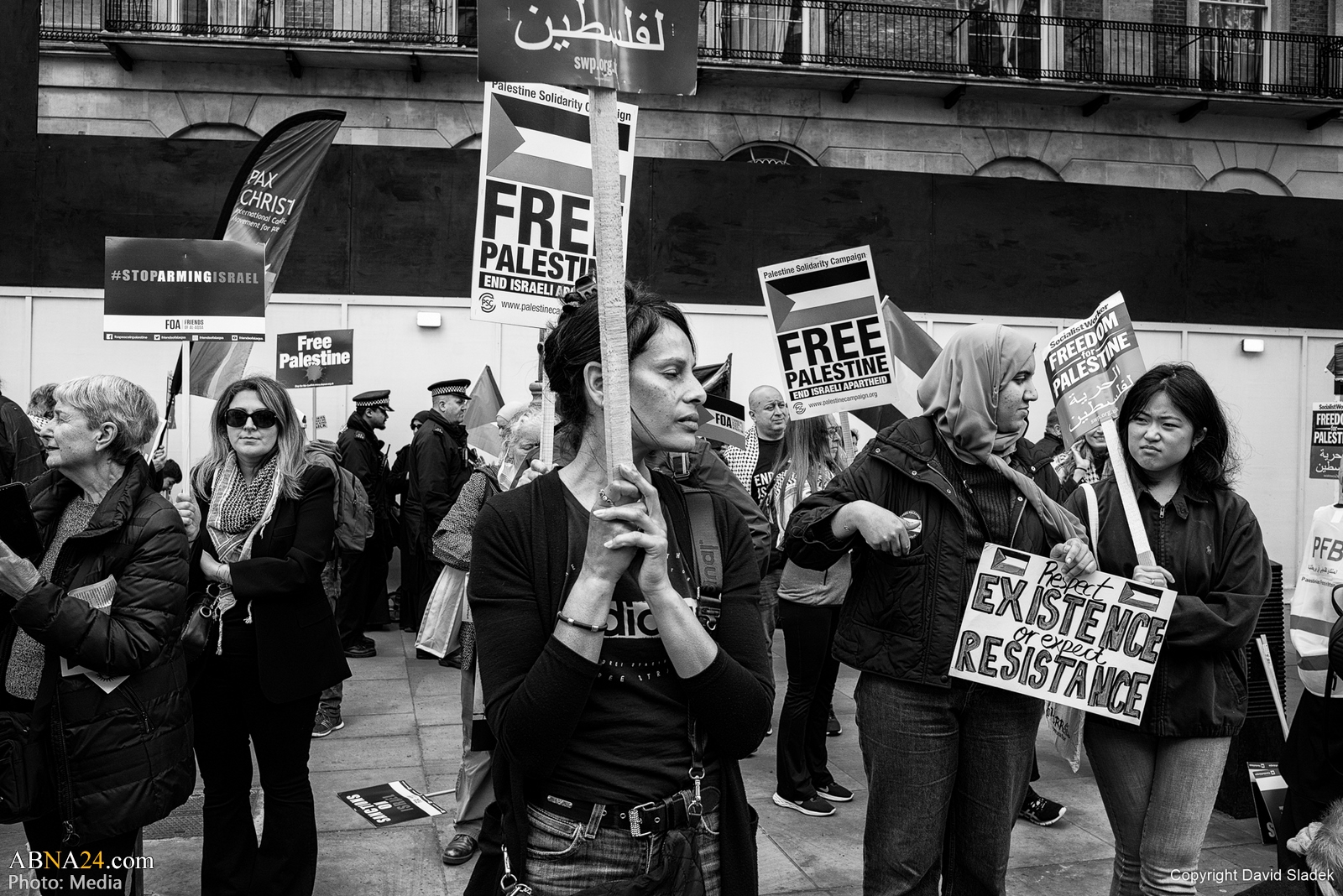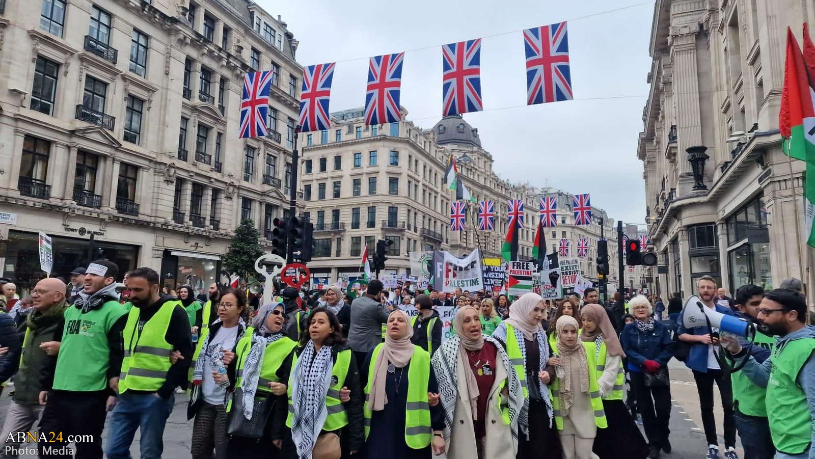 Pro-Palestine activists march to Downing Street in London to demand that the British government pressure ‘Israel’ to stop bombing Gaza and impose sanctions on ‘Israel’ for its 75-year Nakba of Palestine. Thousands of people gathered in London to mark the 75th anniversary of Nakba Day, which marks the establishment of the fake regime of Israel in historical Palestine, forcing nearly 800,000 Palestinians to flee their homes.