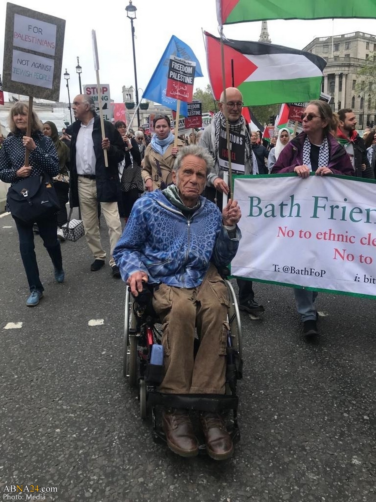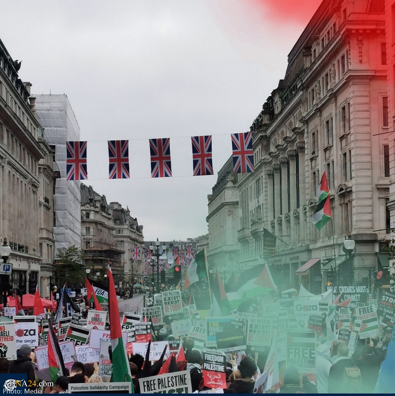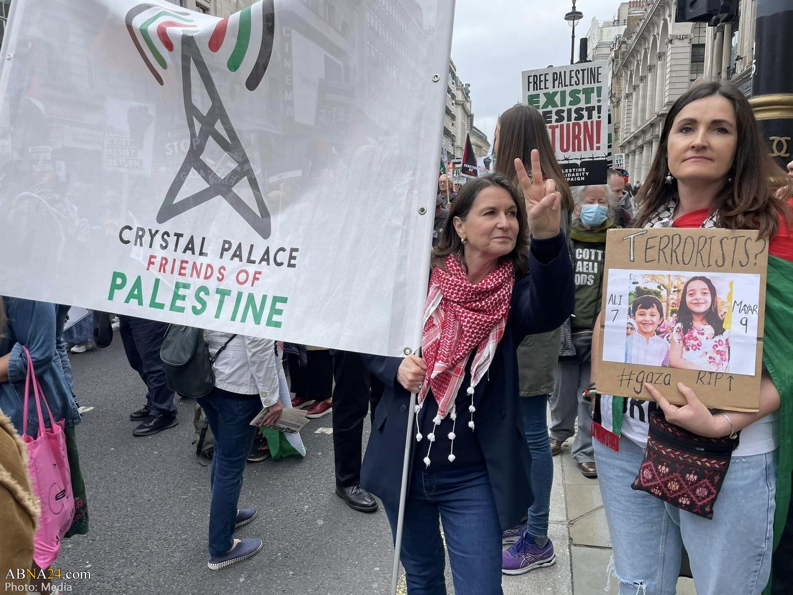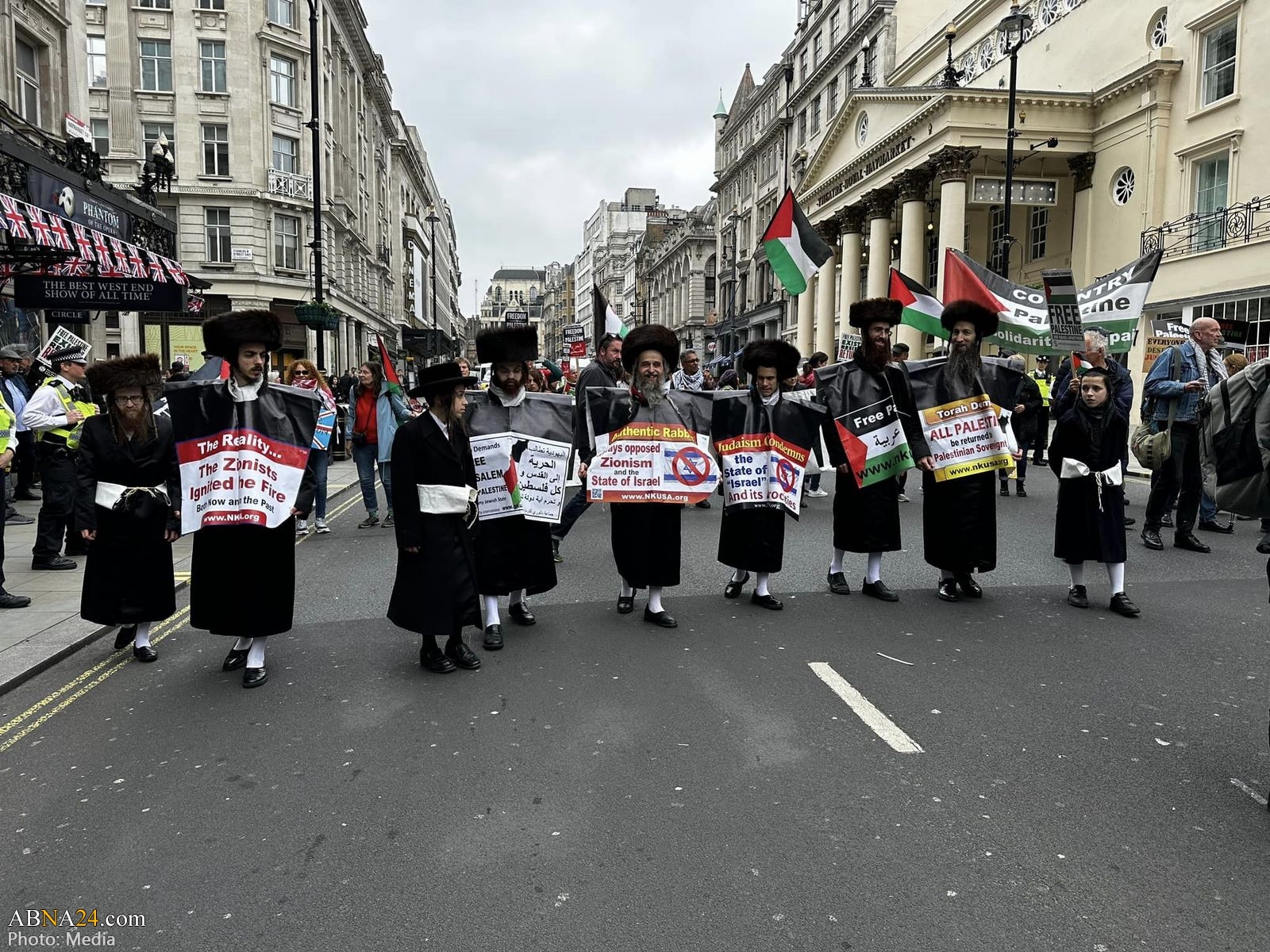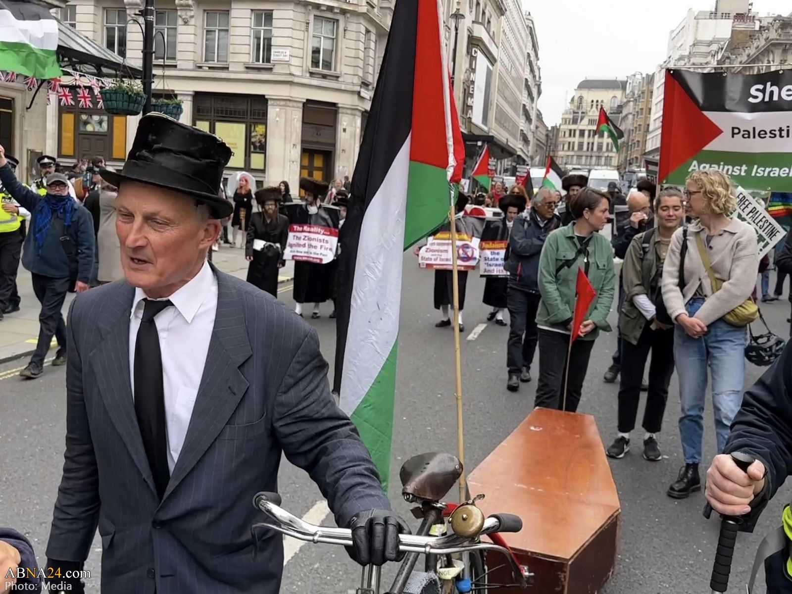 Pro-Palestine activists march to Downing Street in London to demand that the British government pressure ‘Israel’ to stop bombing Gaza and impose sanctions on ‘Israel’ for its 75-year Nakba of Palestine. Thousands of people gathered in London to mark the 75th anniversary of Nakba Day, which marks the establishment of the fake regime of Israel in historical Palestine, forcing nearly 800,000 Palestinians to flee their homes.