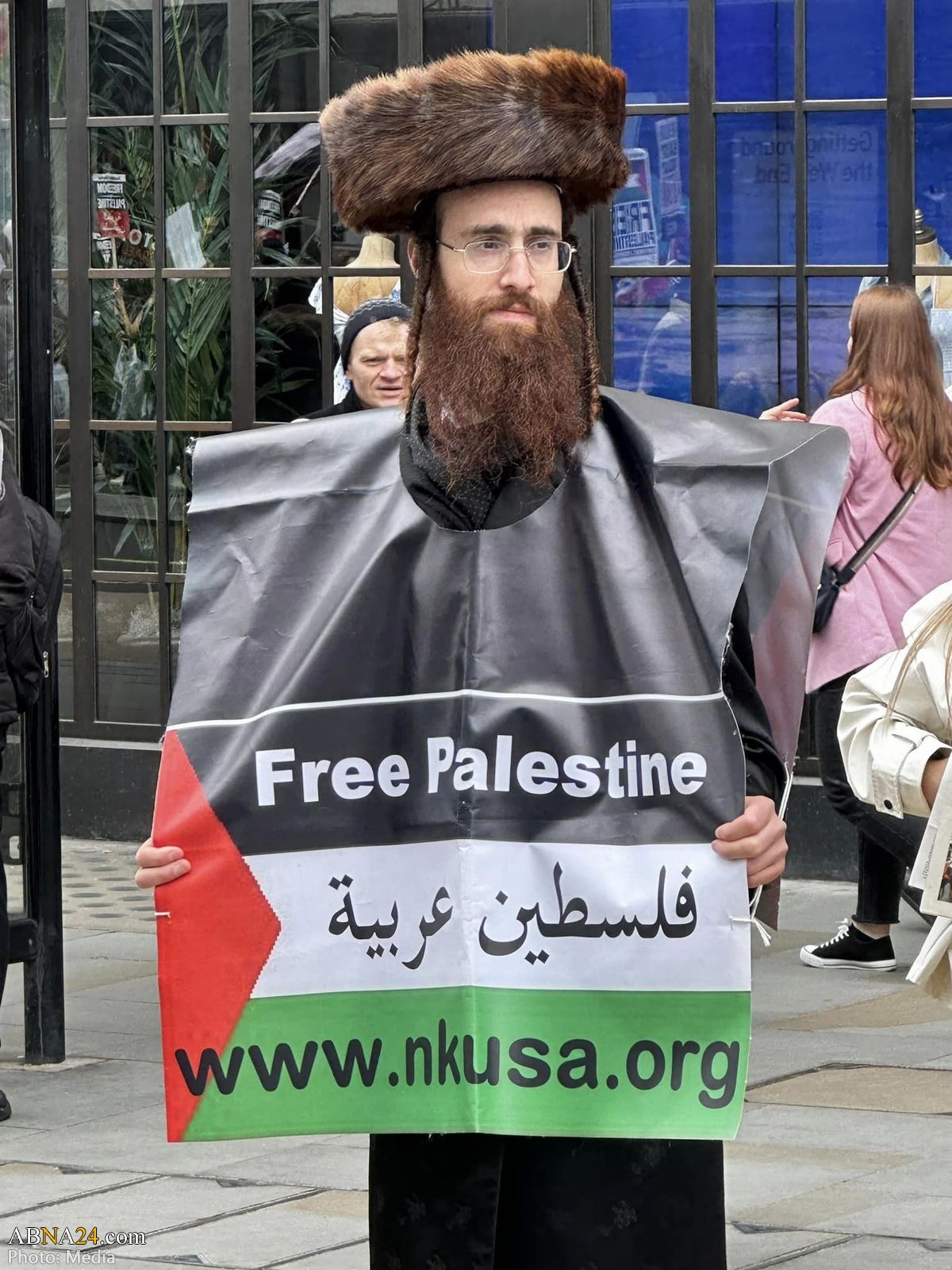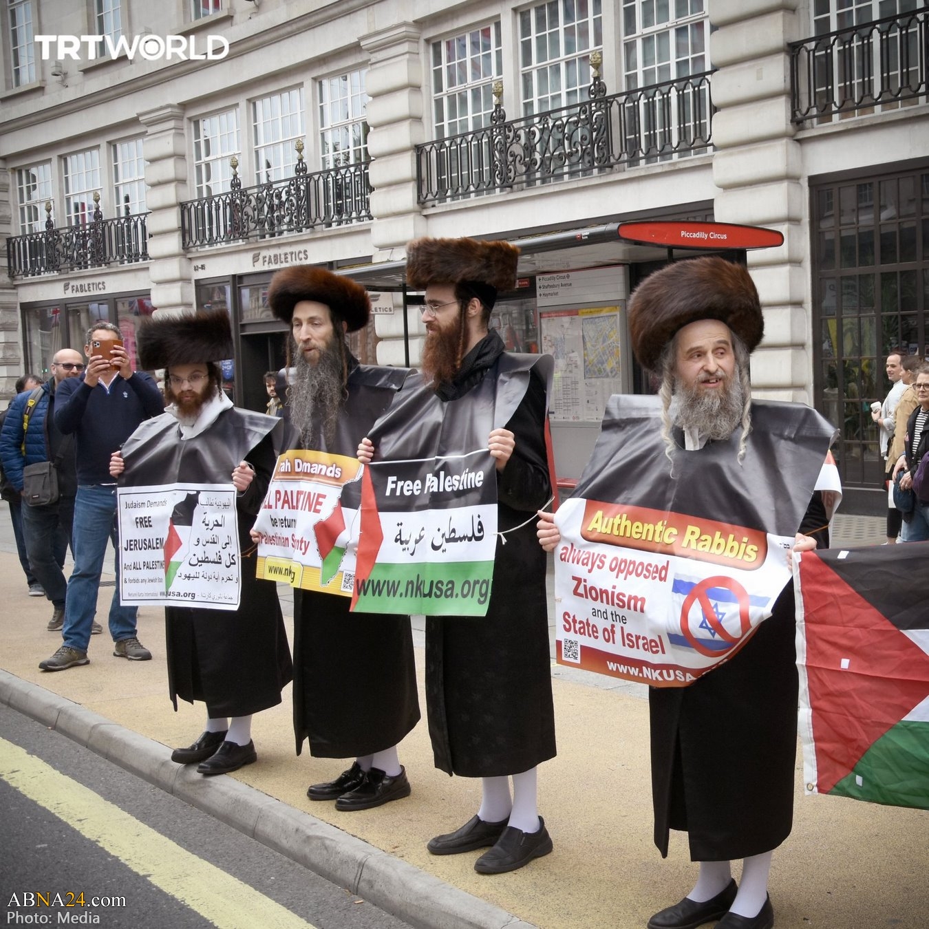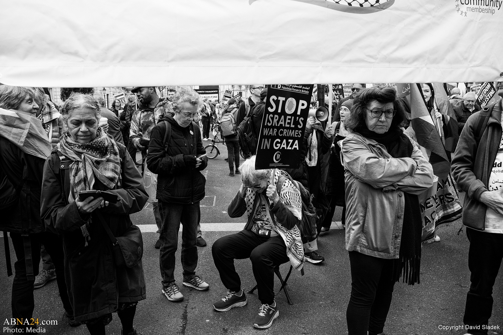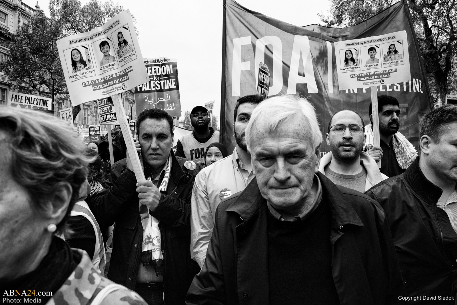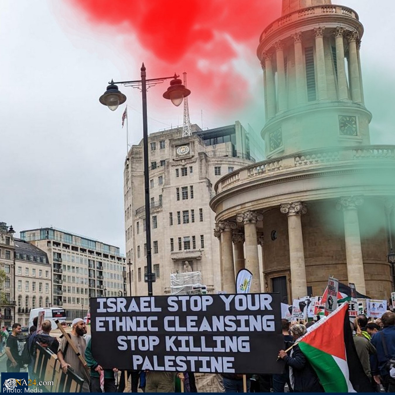 Pro-Palestine activists march to Downing Street in London to demand that the British government pressure ‘Israel’ to stop bombing Gaza and impose sanctions on ‘Israel’ for its 75-year Nakba of Palestine. Thousands of people gathered in London to mark the 75th anniversary of Nakba Day, which marks the establishment of the fake regime of Israel in historical Palestine, forcing nearly 800,000 Palestinians to flee their homes.