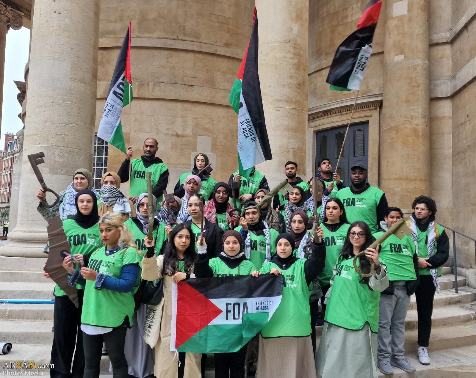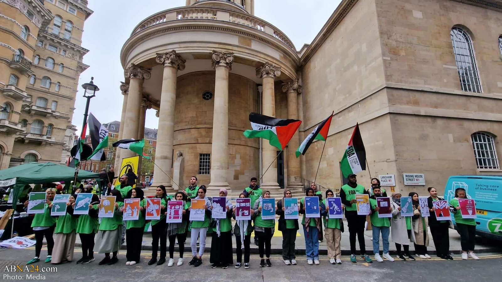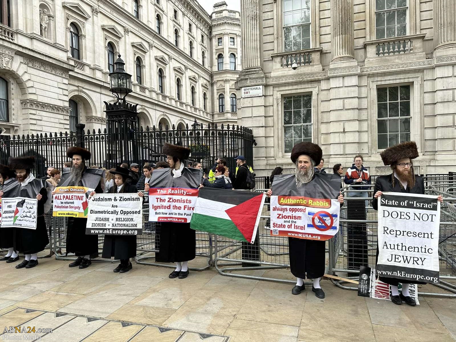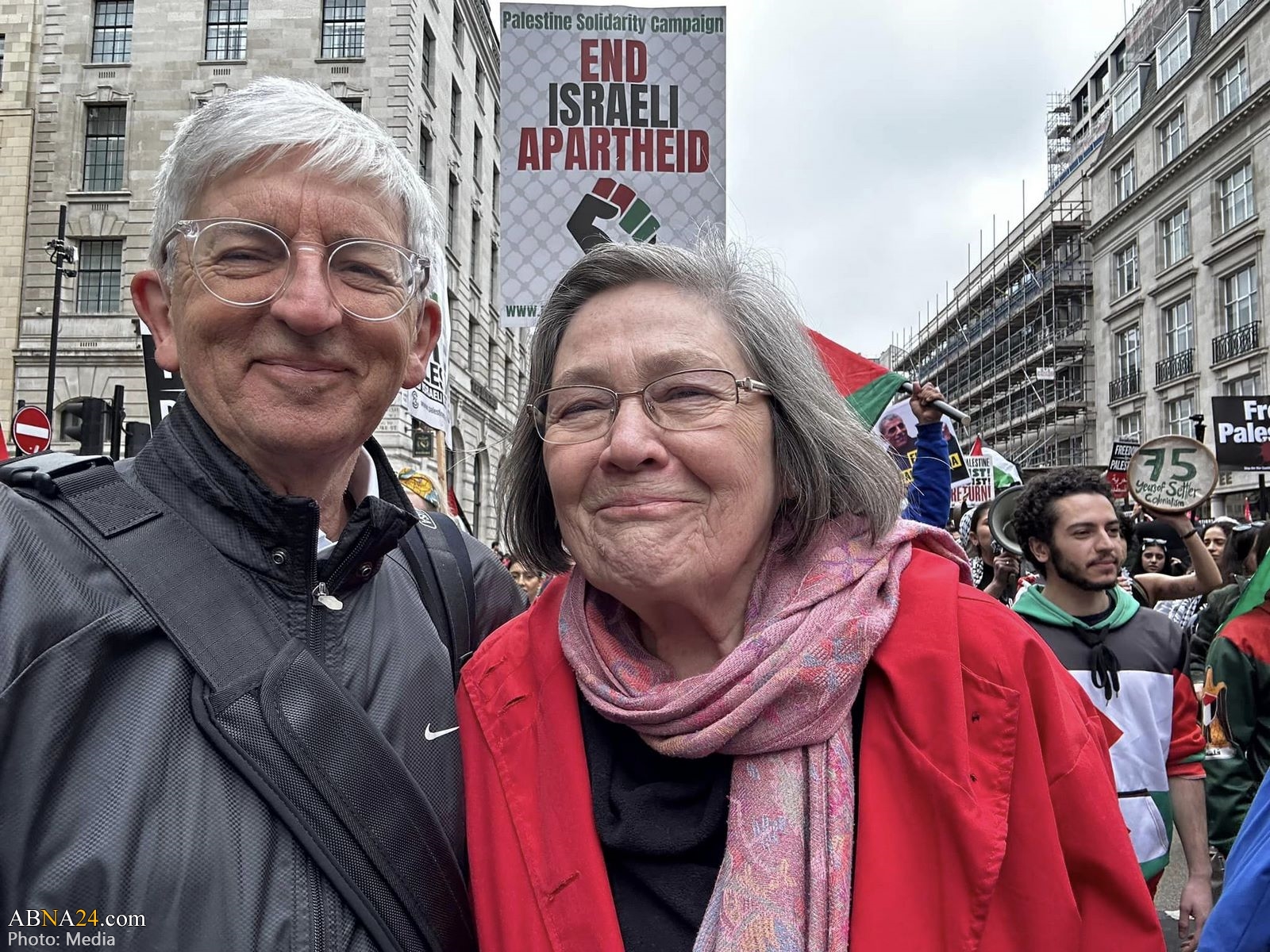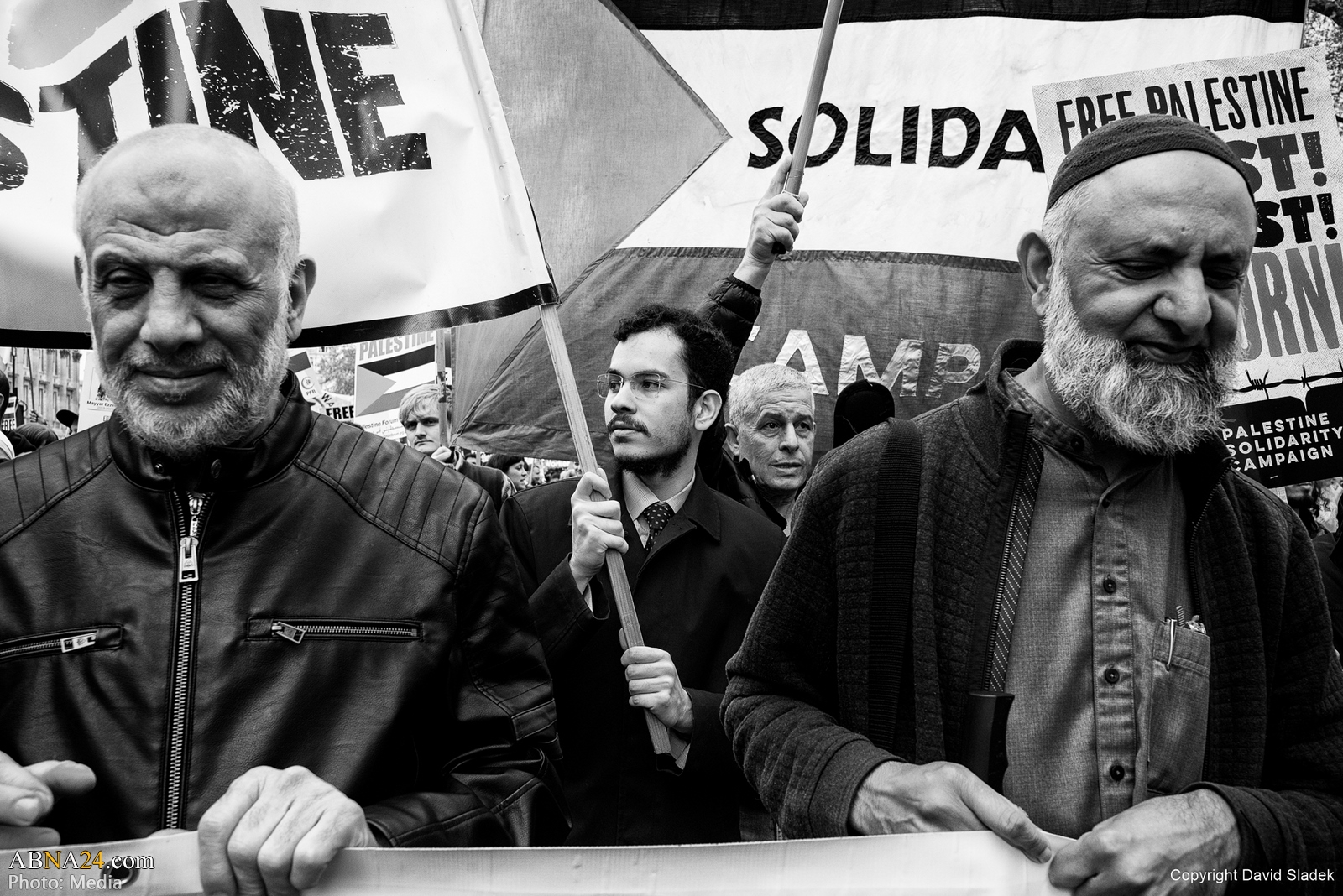 Pro-Palestine activists march to Downing Street in London to demand that the British government pressure ‘Israel’ to stop bombing Gaza and impose sanctions on ‘Israel’ for its 75-year Nakba of Palestine. Thousands of people gathered in London to mark the 75th anniversary of Nakba Day, which marks the establishment of the fake regime of Israel in historical Palestine, forcing nearly 800,000 Palestinians to flee their homes.