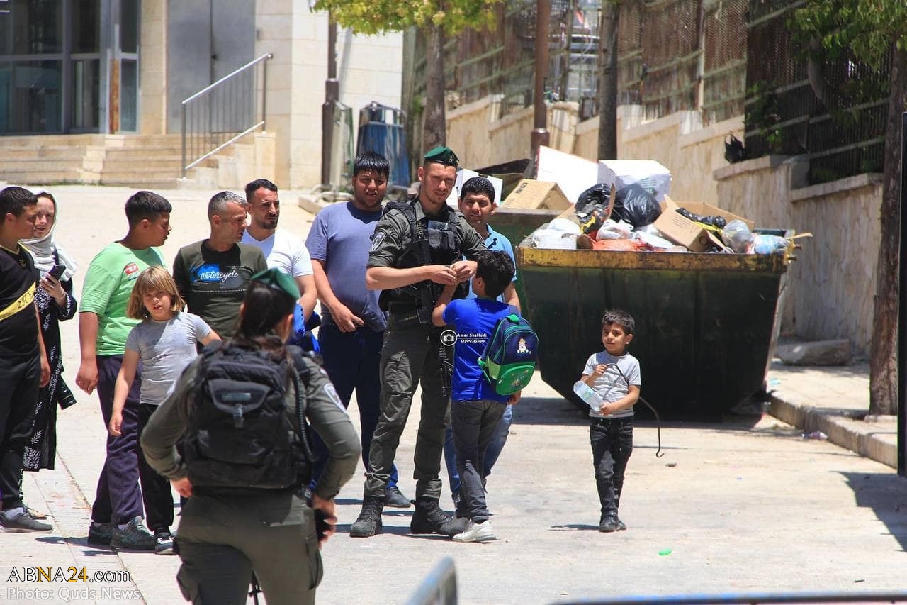 An Israeli occupation soldier seizes the flag of Palestine from a Palestinian child near Al-Ibrahimi mosque in al-Khalil city, May 14, 2023.