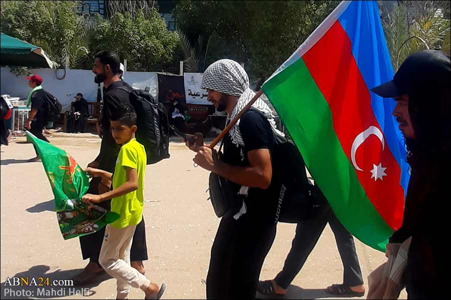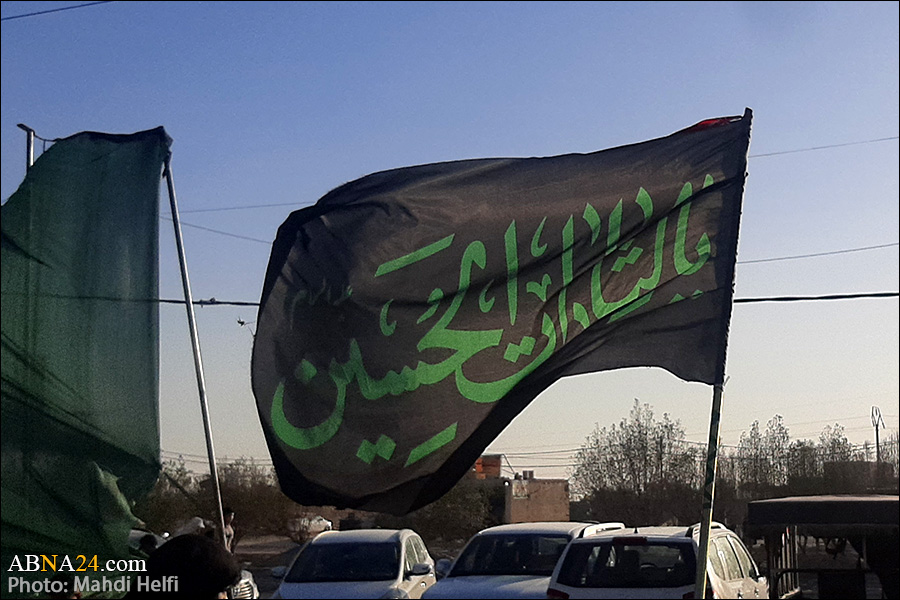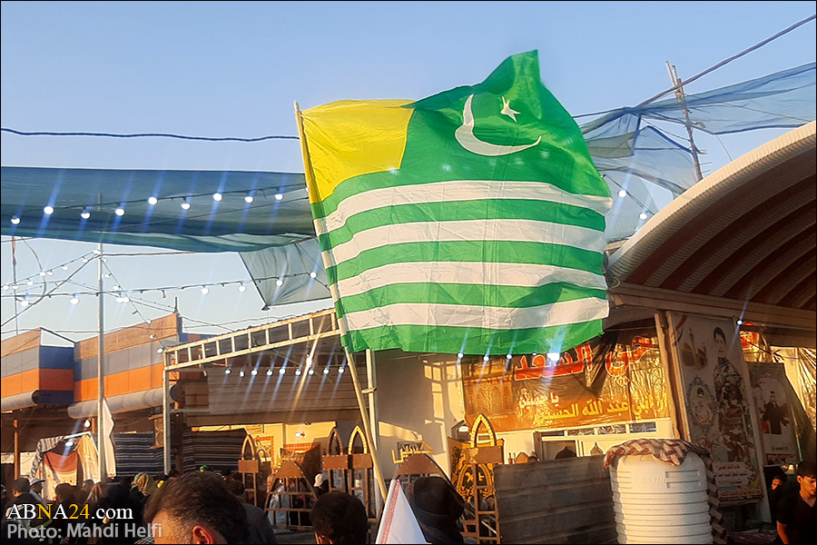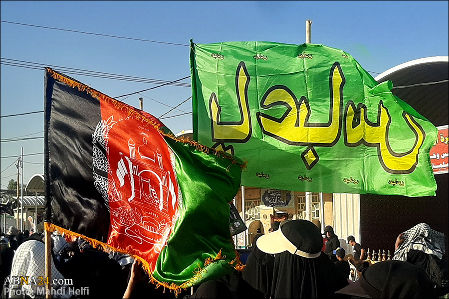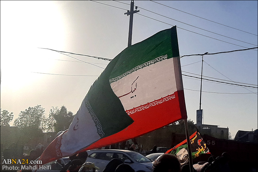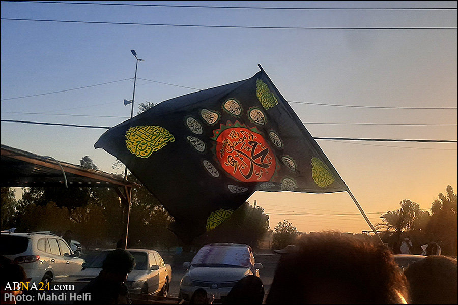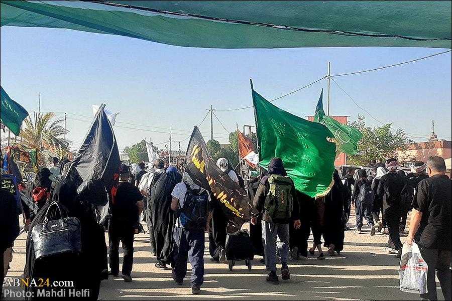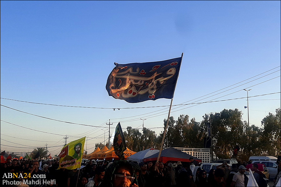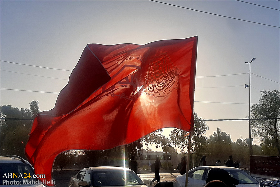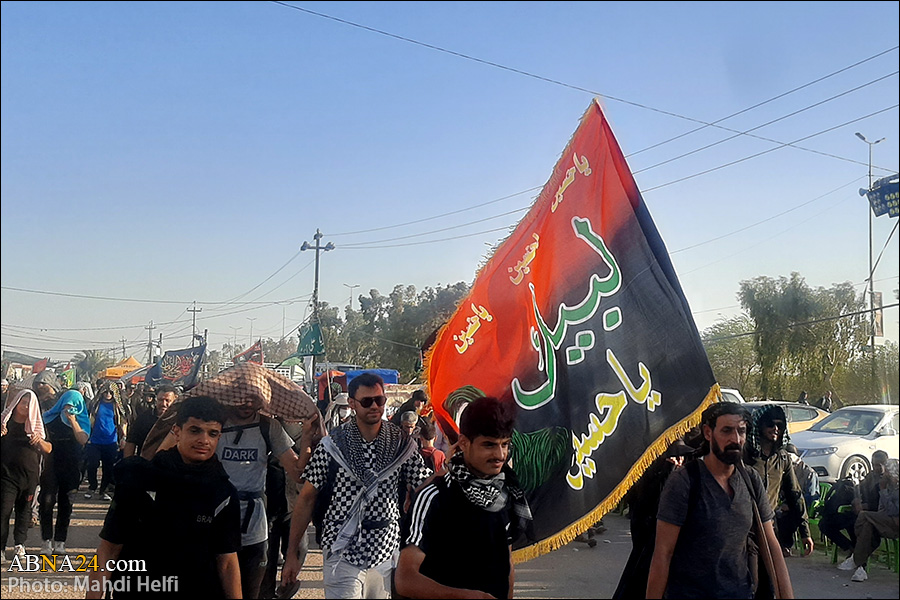 AhlulBayt News Agency (ABNA): Arbaeen pilgrims on foot on Tariq al-Hussein (Najaf to Karbala route) carry different flags with them along the way.