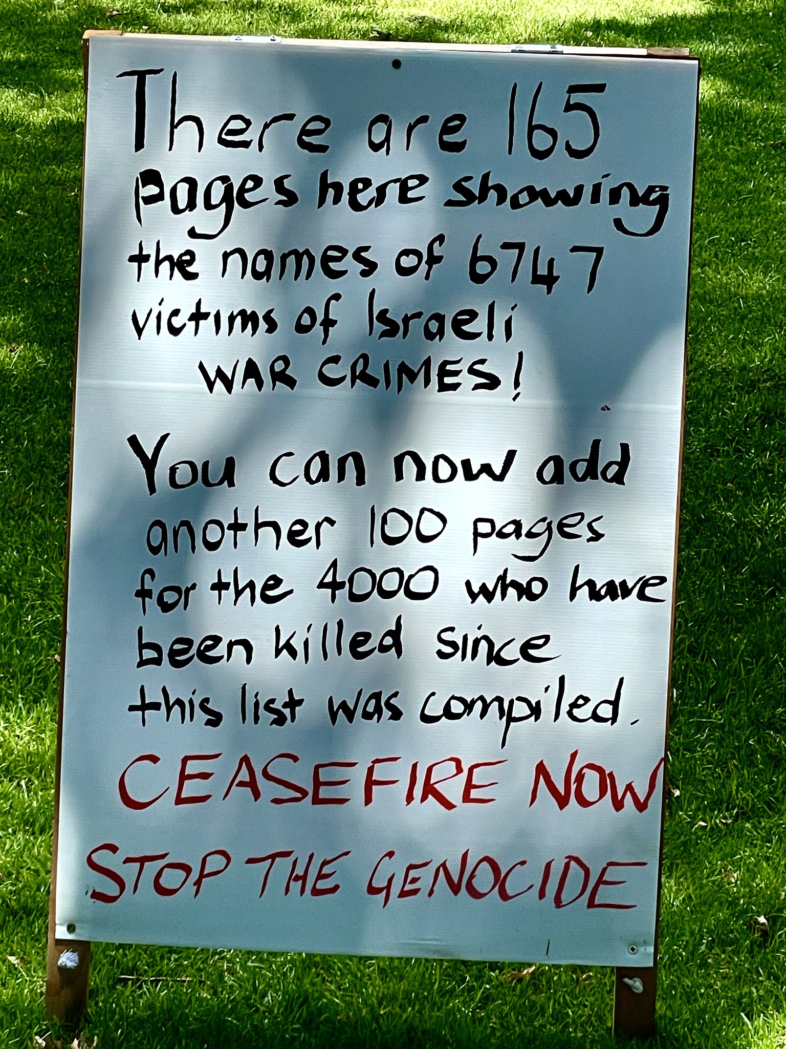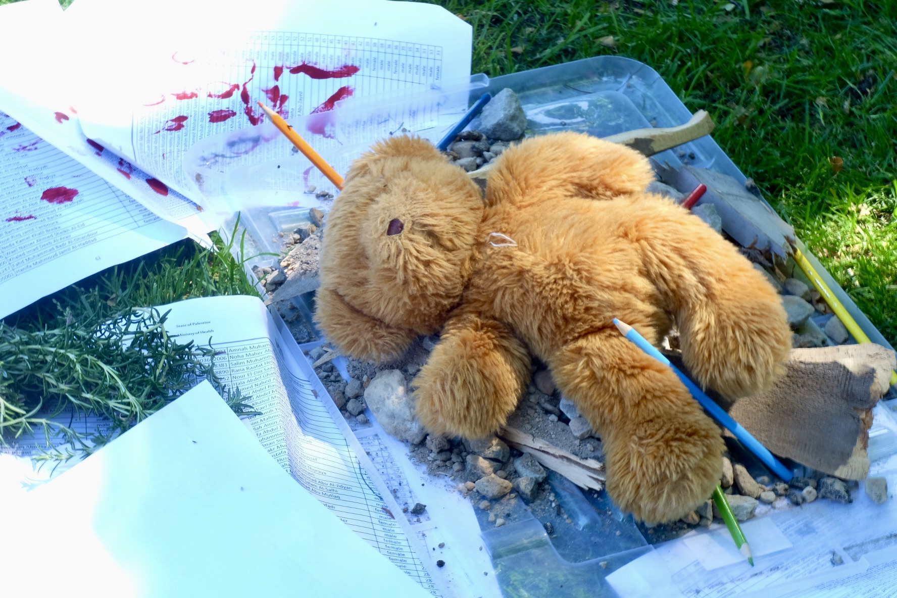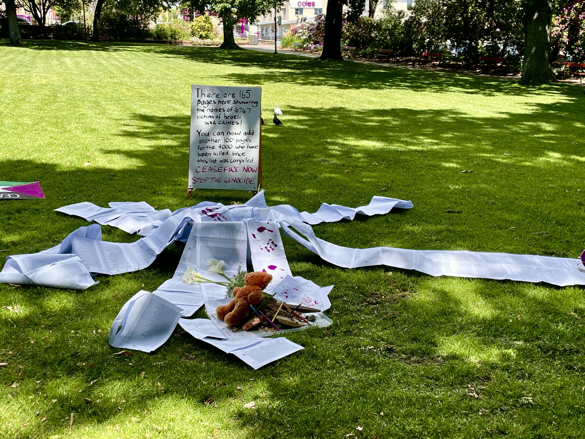 The 'installation' was 165 pages listing the names of 6747 people who had been killed due to Israeli war crimes. Since the list was compiled another approximately 4000 have been martyred. The teddy bear and pencils on a pile of rubble are to represent the children who have died in Gaza,
