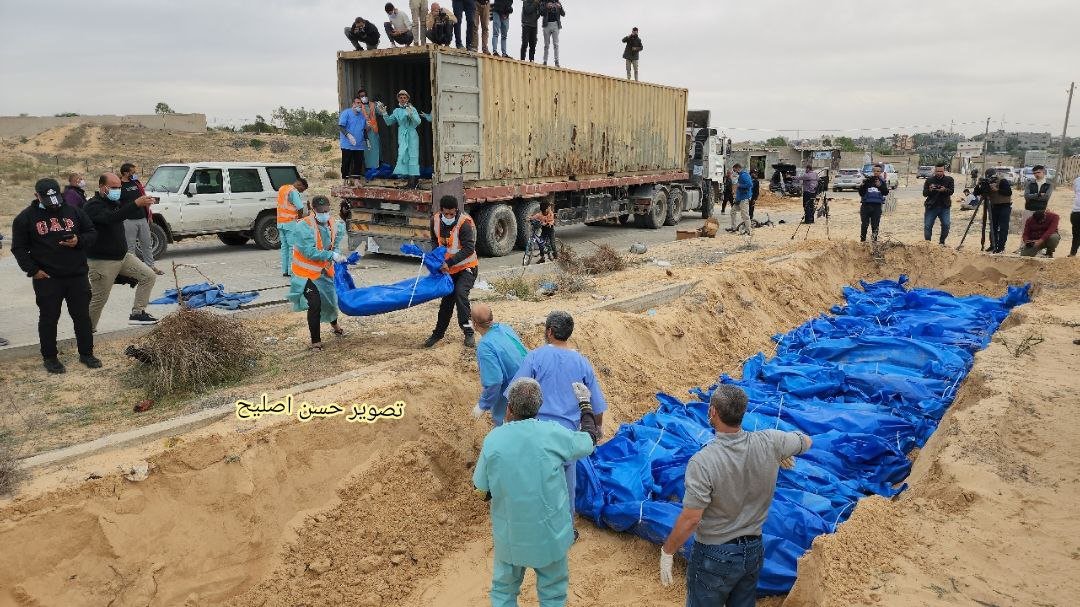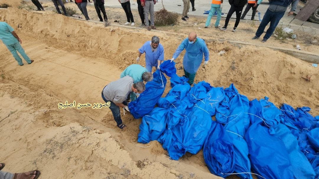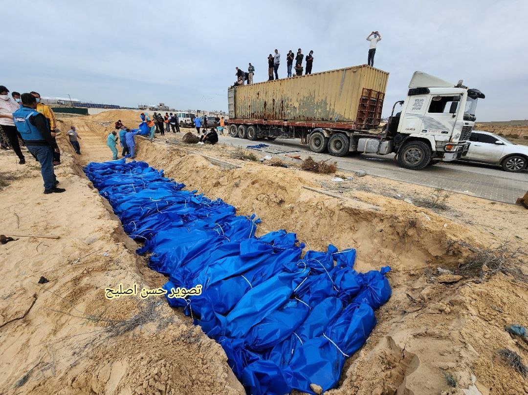 Over a hundred unknown Palestinians were buried in a mass grave this morning in Khan Yunis after being brought from the Al Shifa Hospital in Gaza, which is now under direct Israeli military occupation.