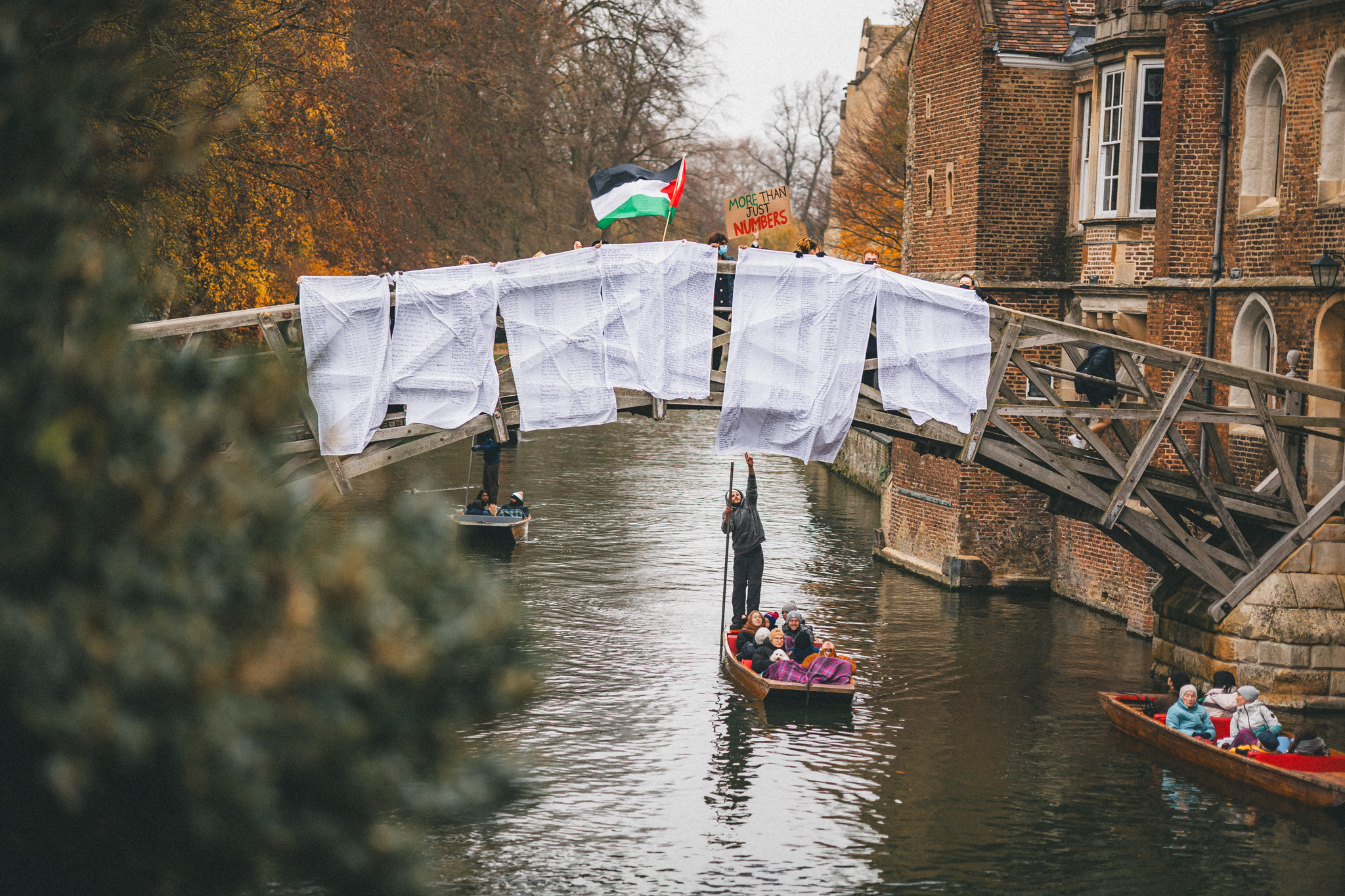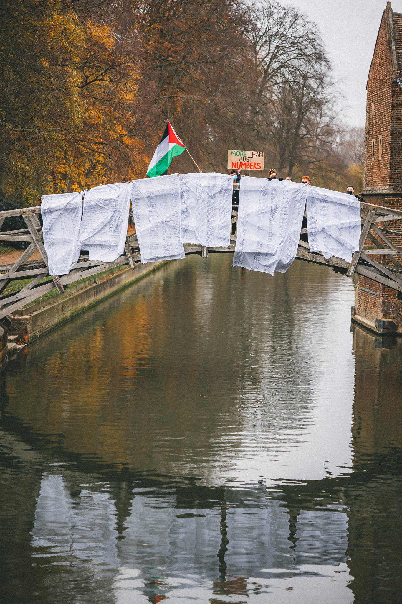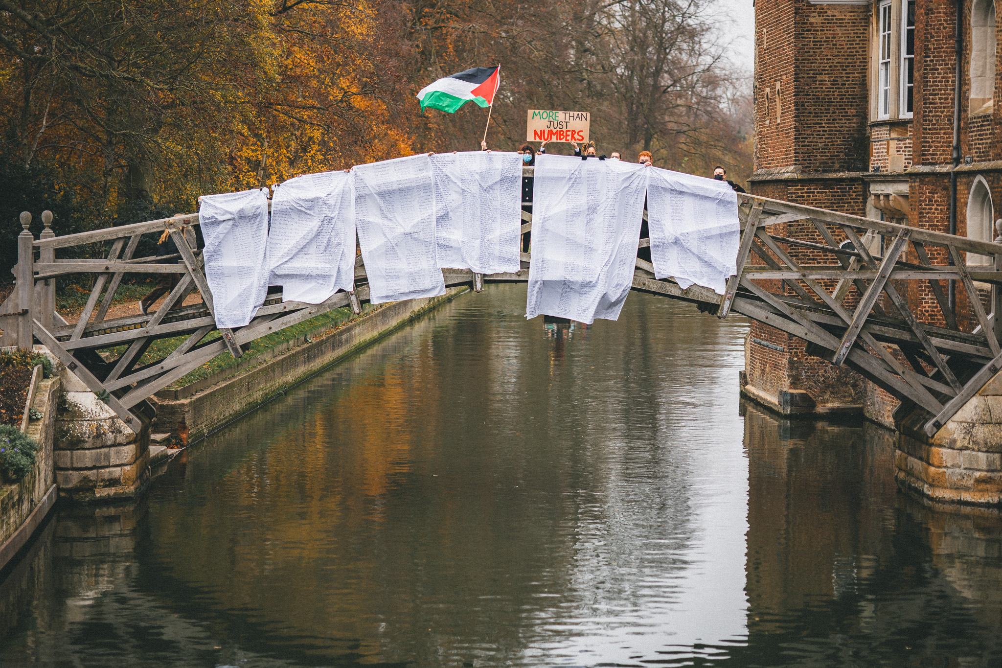 Cambridge students mark 2nd day of truce by displaying the written names of thousands of Gazan martyrs over the historical Mathematical Bridge. They ask for a permanent ceasefire and end to Israeli apartheid. They urged stop arm investments in Israeli companies fuelling the Palestinian genocide.