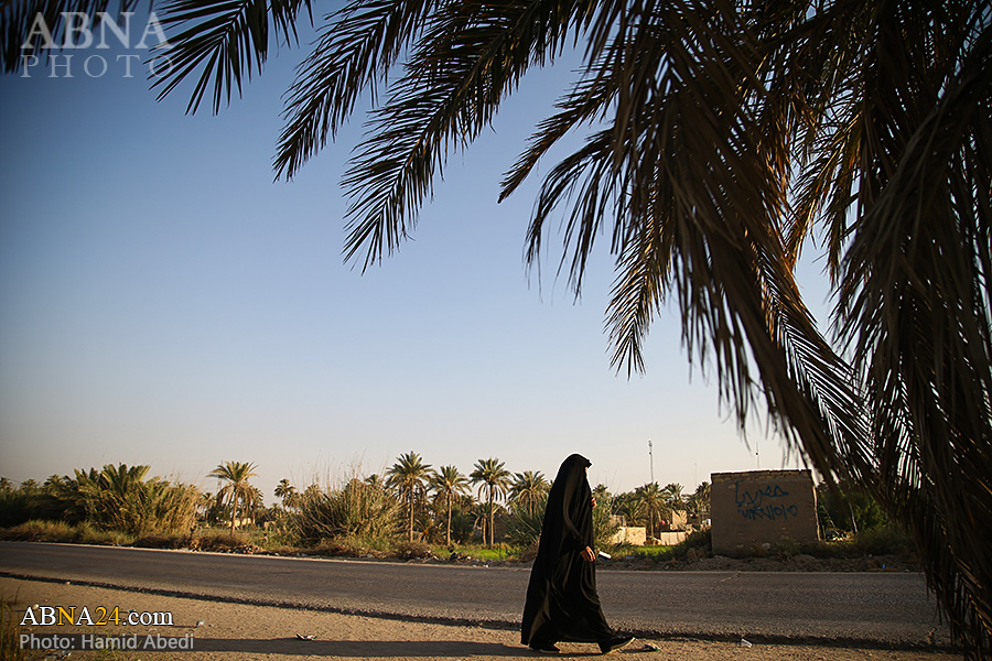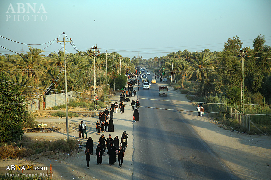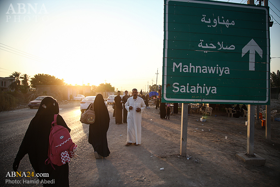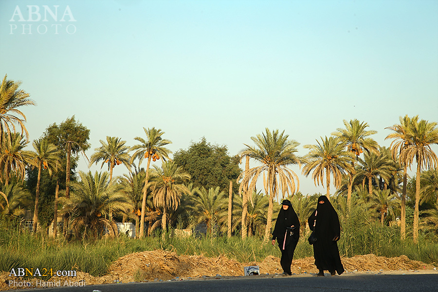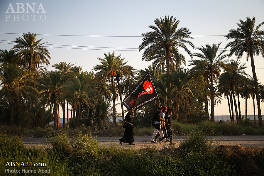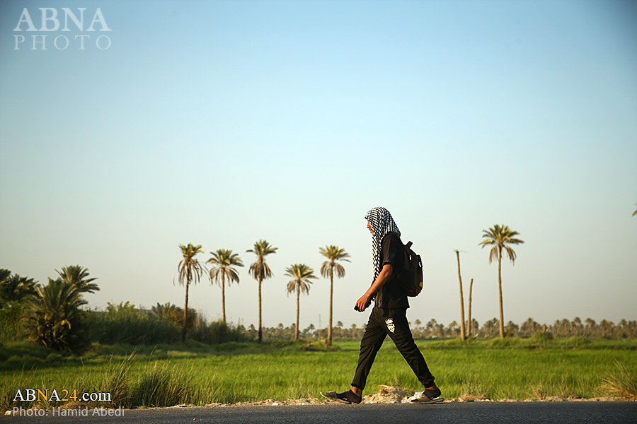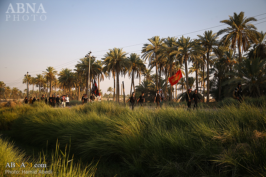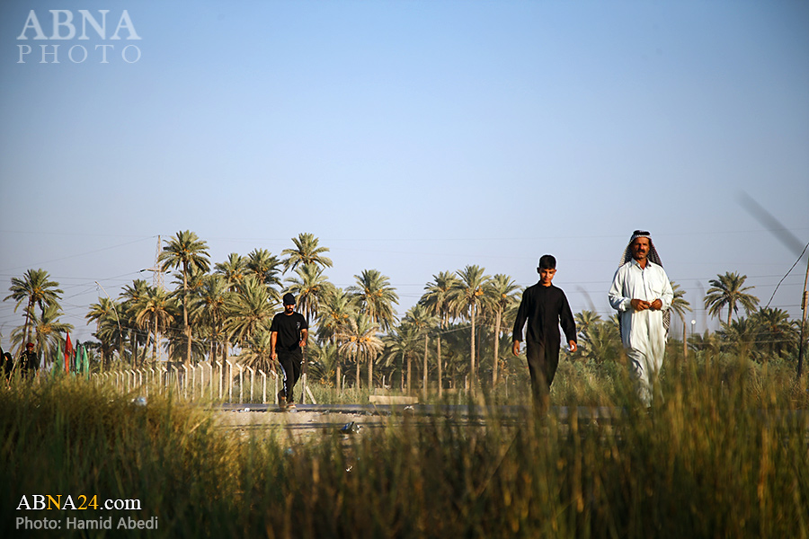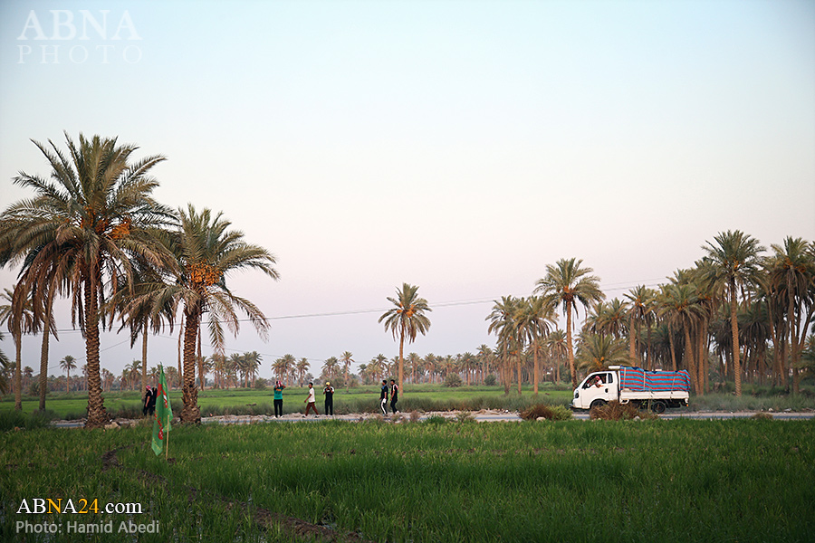 AhlulBayt News Agency (ABNA): Arbaeen pilgrims on their way to Karbala, after passing through the Shamiya route on the edge of the paddy fields of Salahiyah area of Al Diwaniyah, continue their route to go to the city of Kufa and then to Karbala.