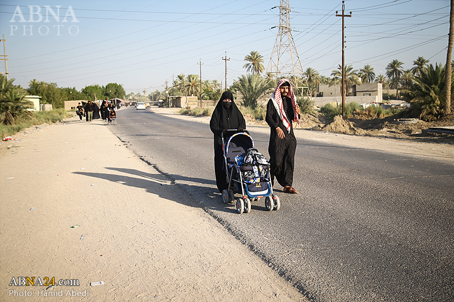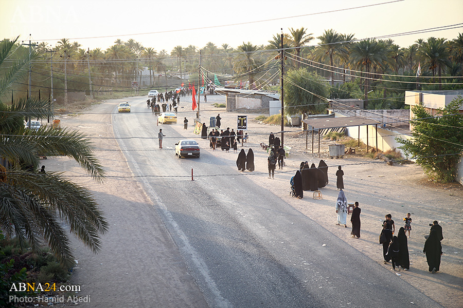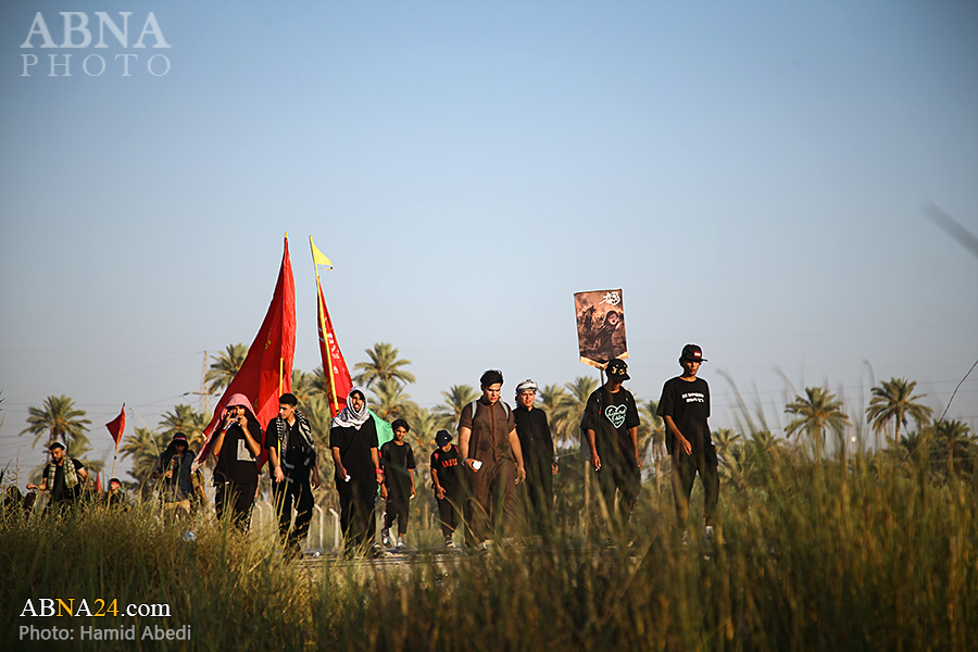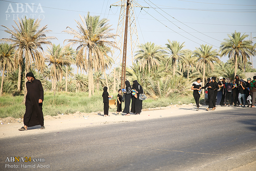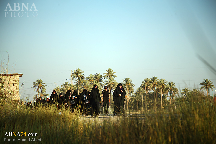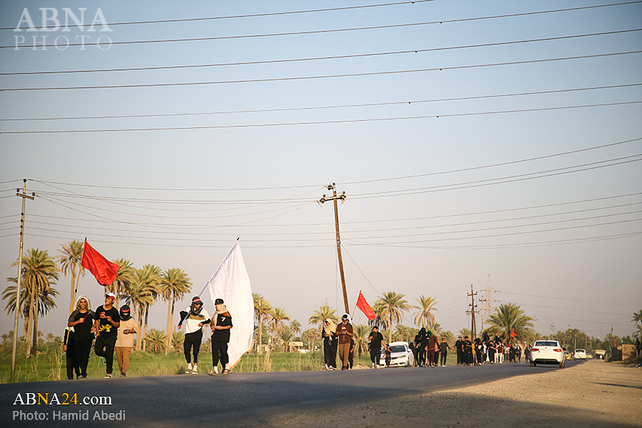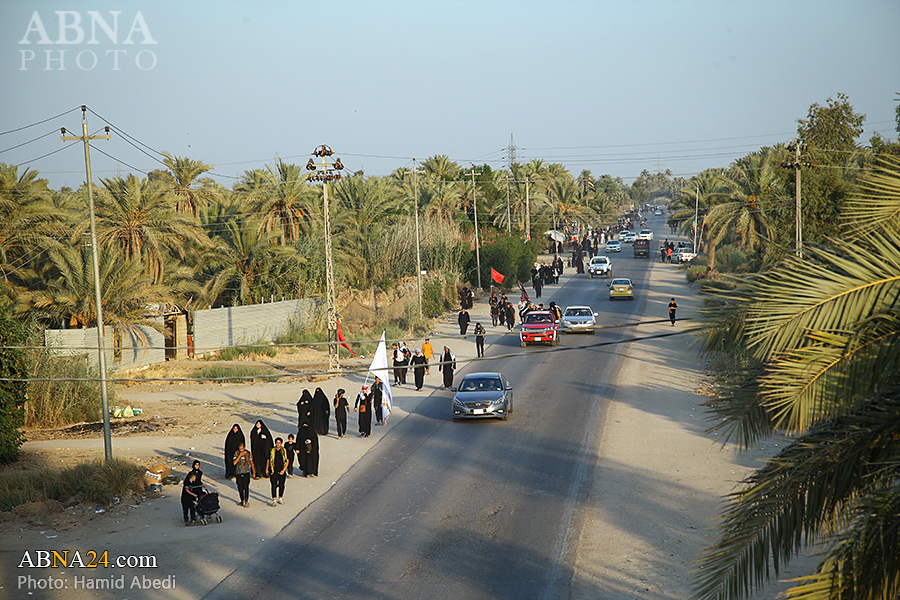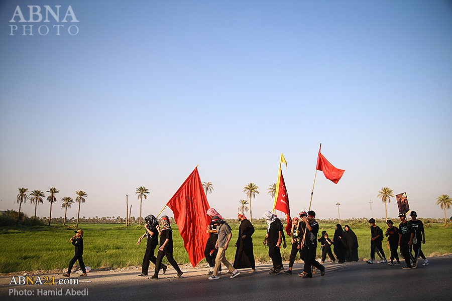 AhlulBayt News Agency (ABNA): Arbaeen pilgrims on their way to Karbala, after passing through the Shamiya route on the edge of the paddy fields of Salahiyah area of Al Diwaniyah, continue their route to go to the city of Kufa and then to Karbala.