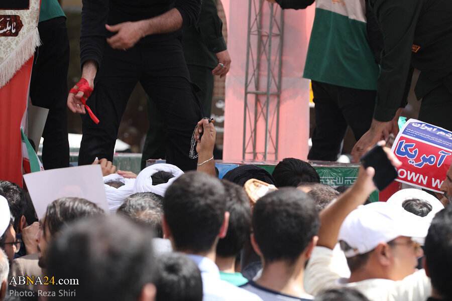 AhlulBayt News Agency: The people of Qom, after offering Friday prayers this week, carried the bodies of the five martyrs of the Zionist regime's attacks on our country from the Quds Mosque in Qom to the Martyrs' Crossroads in the city. The bodies of these martyrs were then transferred to the Martyrs' Cemetery in Qom and the holy Jamkaran Mosque for burial.
