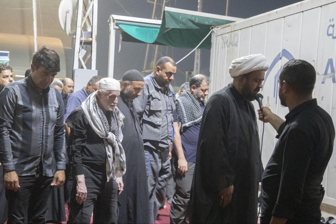 The congregational prayer for the Isha and Maghrib prayers was held on the visitors' route from Najaf Ashraf to Karbala, at the Aba Al-Fadl Al-Abbas (peace be upon him) service complex for esteemed visitors, led by Sheikh Muhammad Al-Kariti from the Religious Affairs Department of the Al-Abbas's (p) Holy Shrine.
