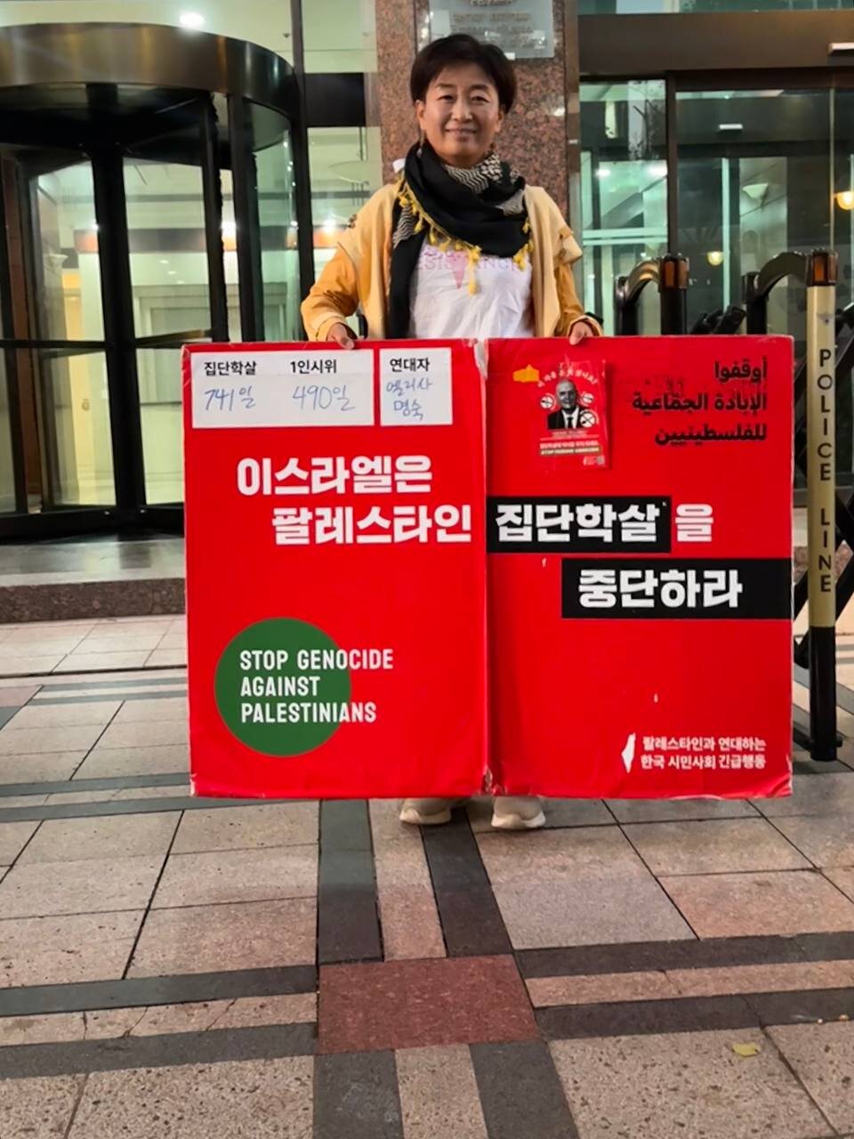 Day 490 of the Relay Solo Protest in Front of the Israeli Embassy! This pro-Palestine protest was carried out by individual supporter Elisa and human rights activist Myung-sook from the Baram Network for Human Rights.