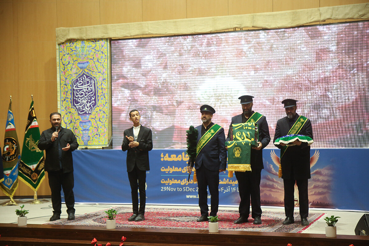AhlulBayt News Agency: On Wednesday, December 3, a ceremony honoring people with disabilities in Qom Province was held on the occasion of the International Day of Persons with Disabilities. The event took place at the conference hall of the Sacred Defense Garden Museum in Qom, with the participation of servants of the holy shrine of Hazrat Fatima Masoumeh (s.a.). The program featured flag-bearing rituals and the distribution of blessed items from the holy shrine.