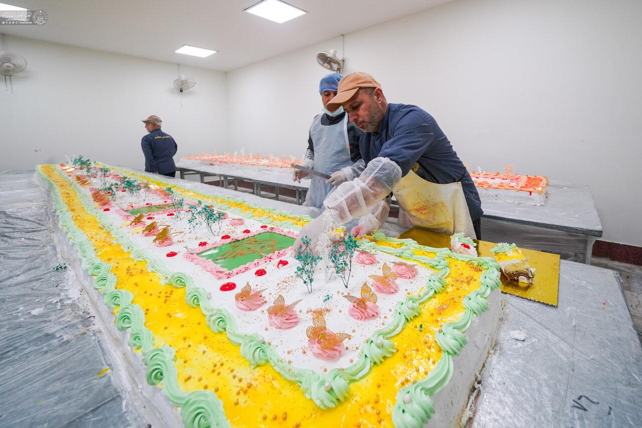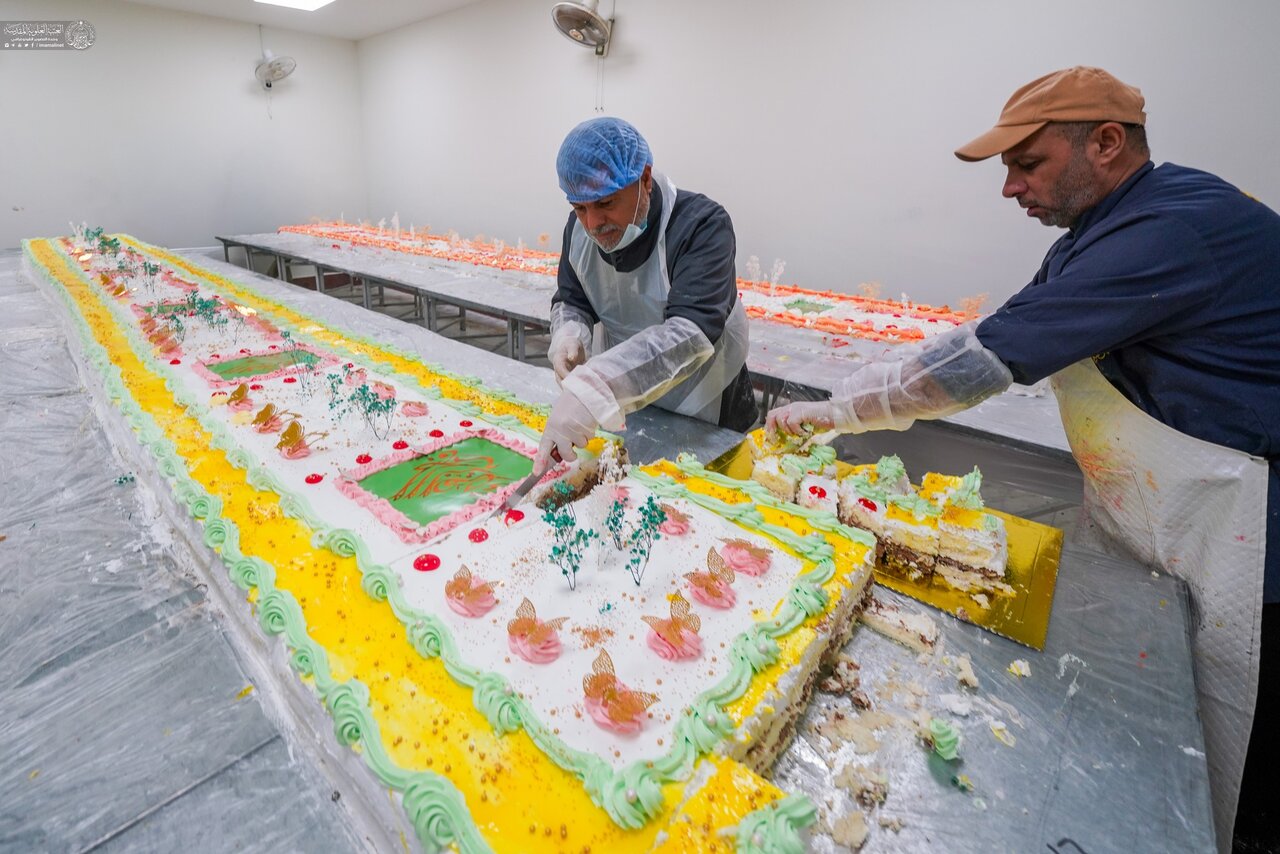 In commemoration and blessing of the radiant birth of Lady Fatimah al-Zahra (peace be upon her), on her pure birthday, the staff of the Visitors’ Hospitality Department at the Holy Alawi Shrine created large cakes decorated with phrases of love and loyalty to the pure Lady Fatimah al-Zahra (peace be upon her).