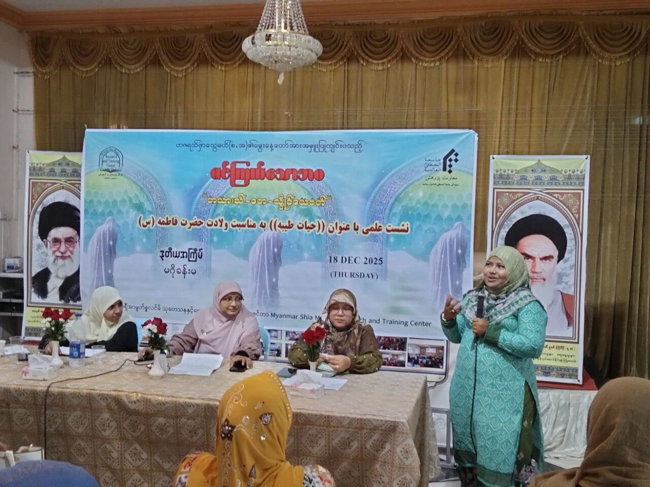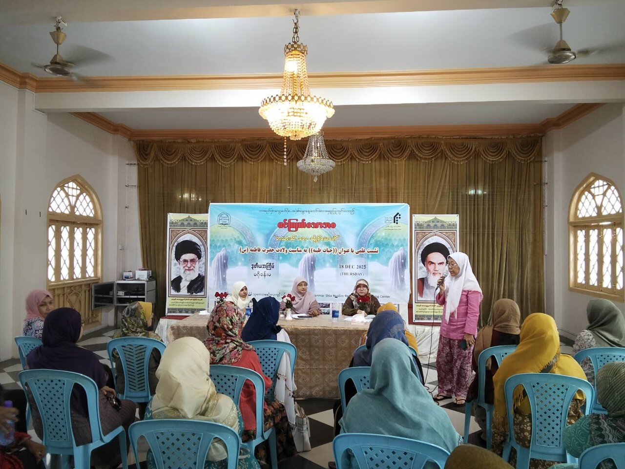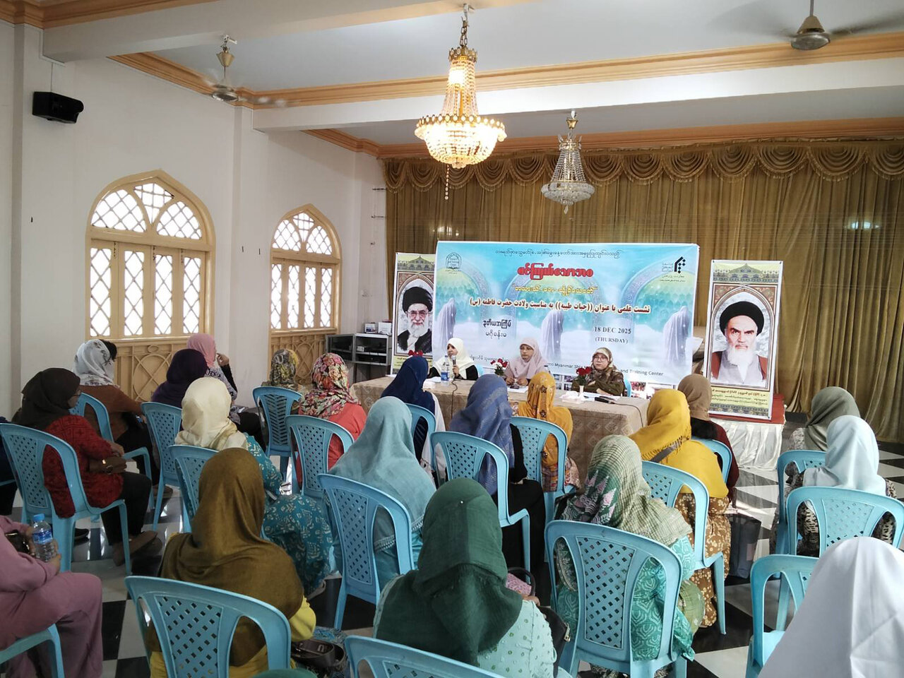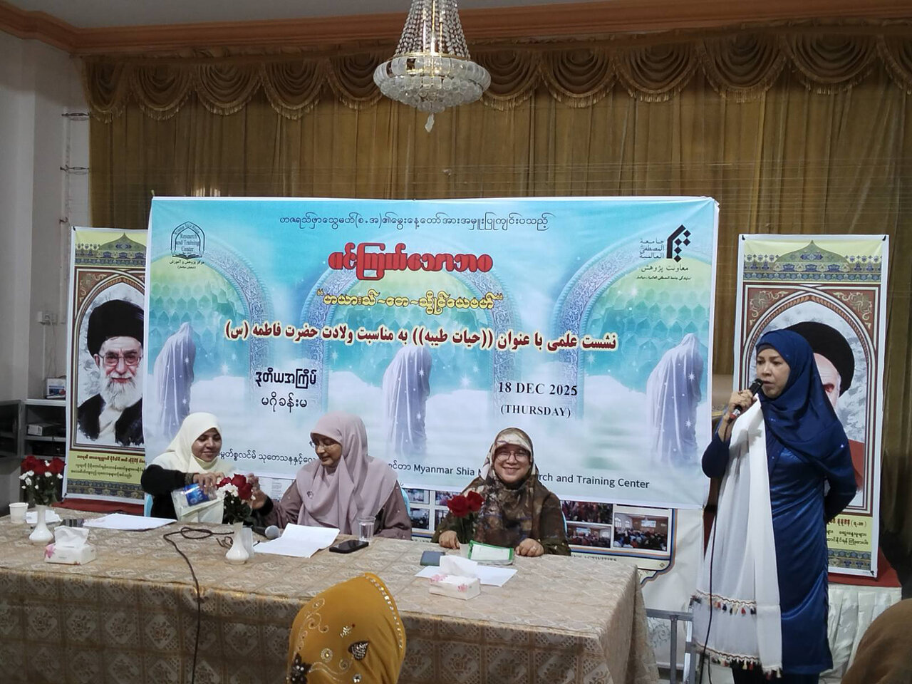 AhlulBayt News Agency: On the occasion of the birth anniversary of Hazrat Fatima Zahra (S.A), a literary discussion titled “Hayat-e-Tayyeba” (The Pure Life) was held on Thursday, 18 December 2025, at Maghosi Ajma Mosque in Yangon under the supervision of the Myanmar Shia Muslim Research and Training Center. The event was moderated by Alima Zainab Madina Baik, Deputy Director of Training at the Myanmar Shia Muslim Research and Training Center, who also delivered the opening speech. The discussion focused on “Fatima Zahra (PBUH) as a Role Model for Today’s Muslim Women.”