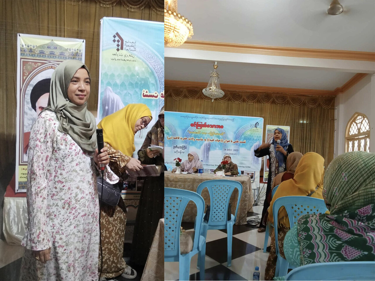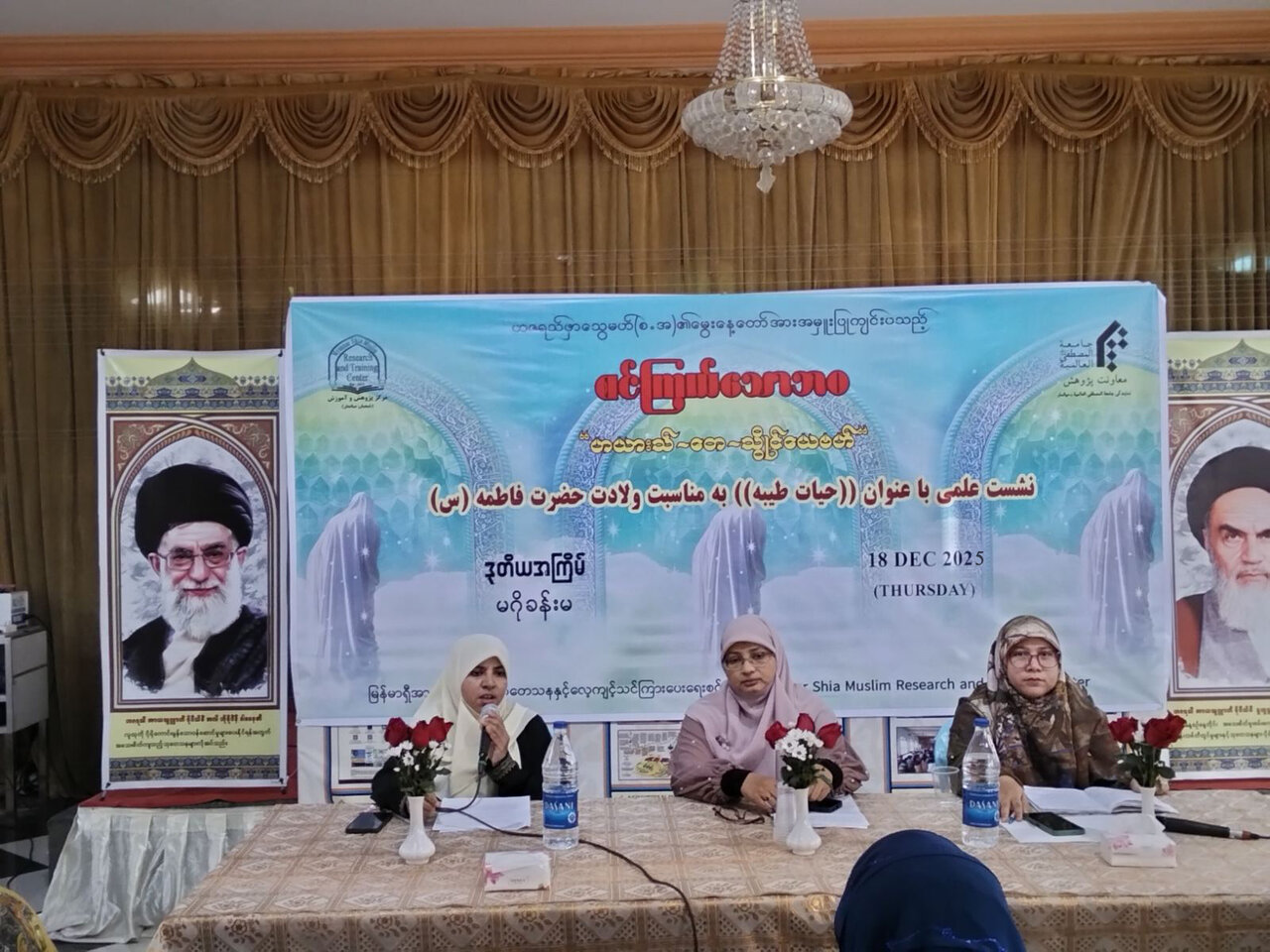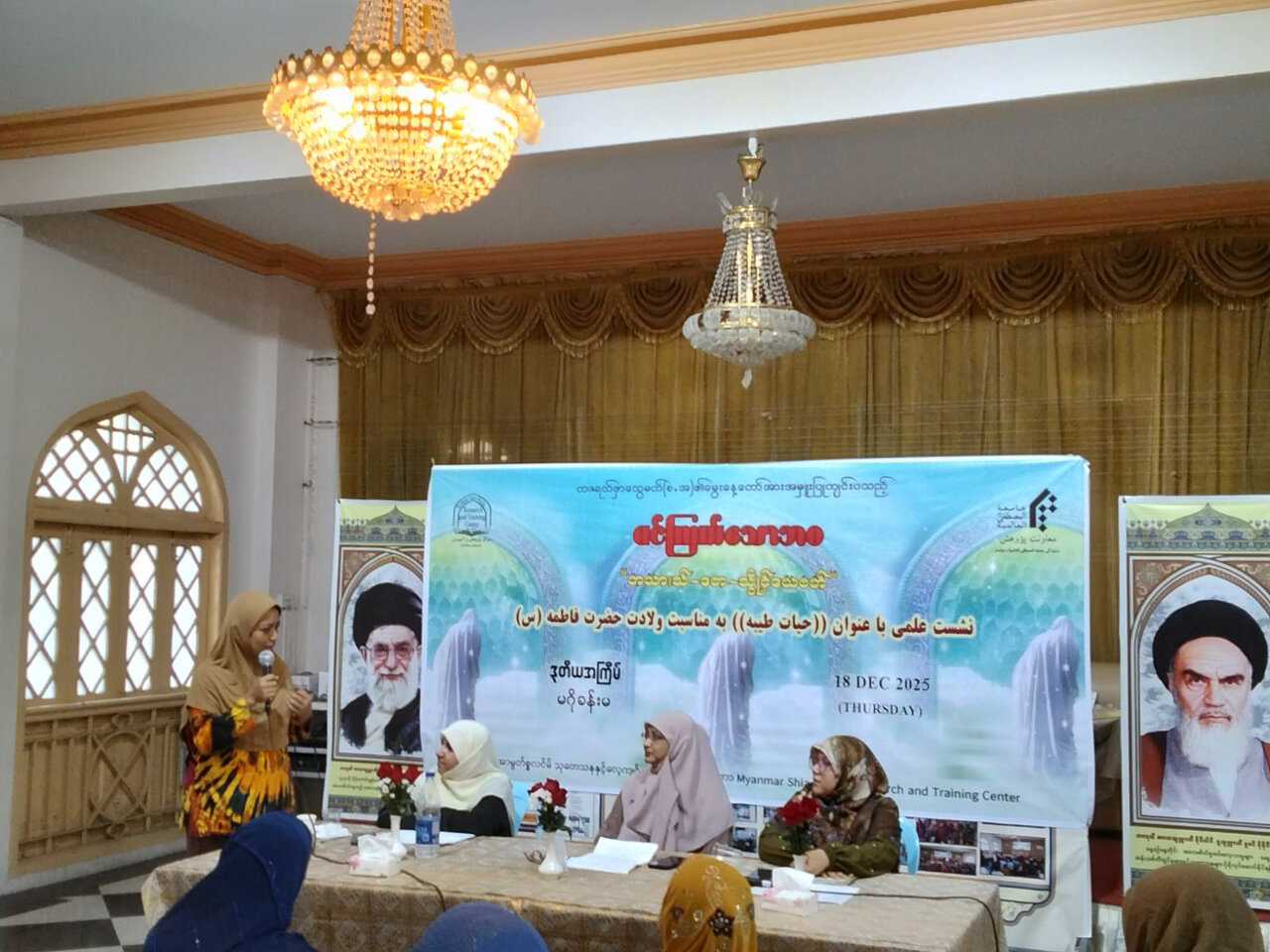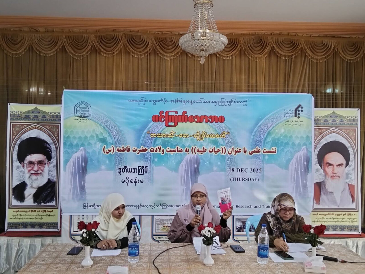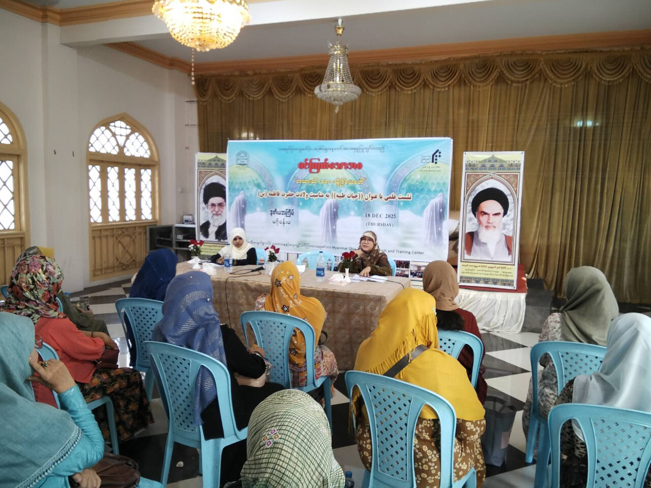 AhlulBayt News Agency: On the occasion of the birth anniversary of Hazrat Fatima Zahra (S.A), a literary discussion titled “Hayat-e-Tayyeba” (The Pure Life) was held on Thursday, 18 December 2025, at Maghosi Ajma Mosque in Yangon under the supervision of the Myanmar Shia Muslim Research and Training Center. The event was moderated by Alima Zainab Madina Baik, Deputy Director of Training at the Myanmar Shia Muslim Research and Training Center, who also delivered the opening speech. The discussion focused on “Fatima Zahra (PBUH) as a Role Model for Today’s Muslim Women.”