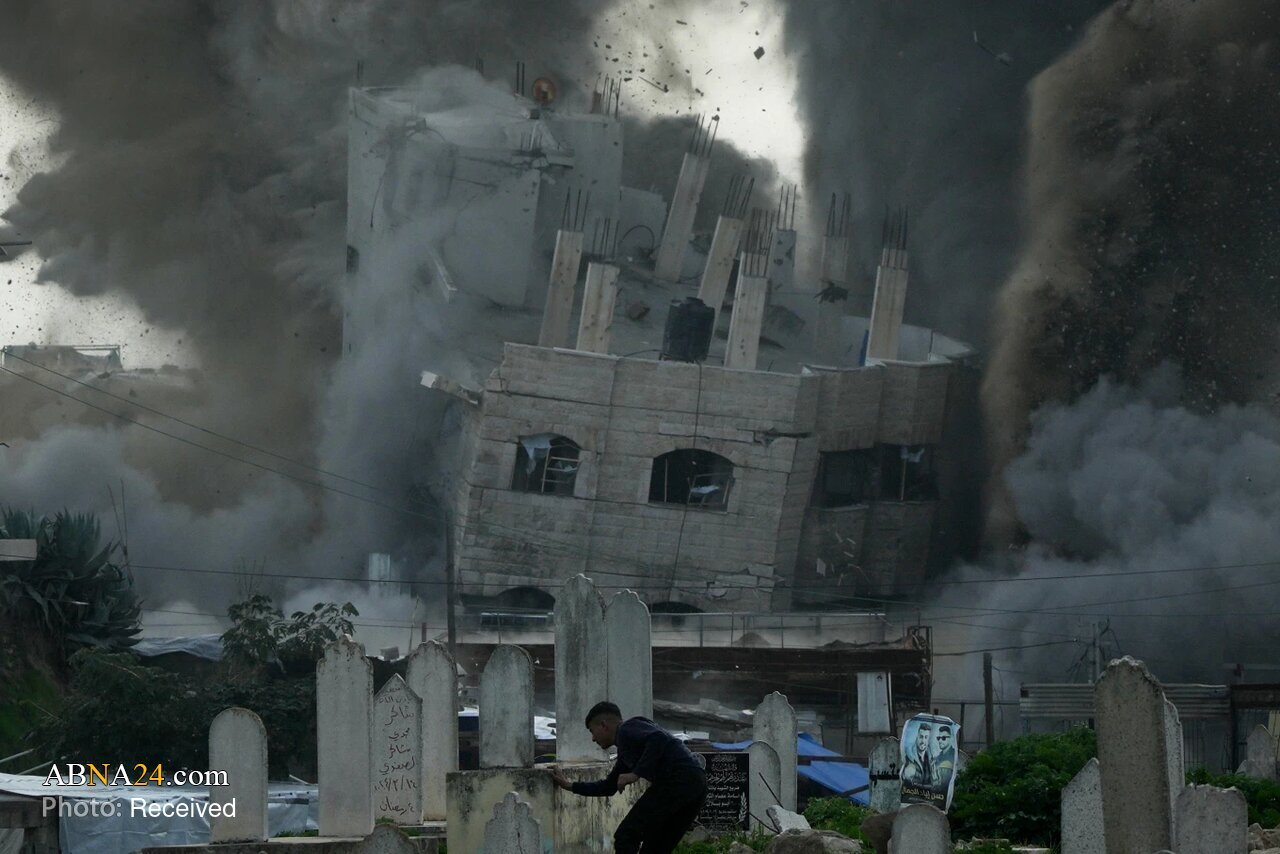 AhlulBayt News Agency: During an Israeli airstrike on an area in Gaza City, a photojournalist captured the moment a missile was visible in the sky just before impact, while people in a nearby cemetery—located close to the target—were seen fleeing in panic.
