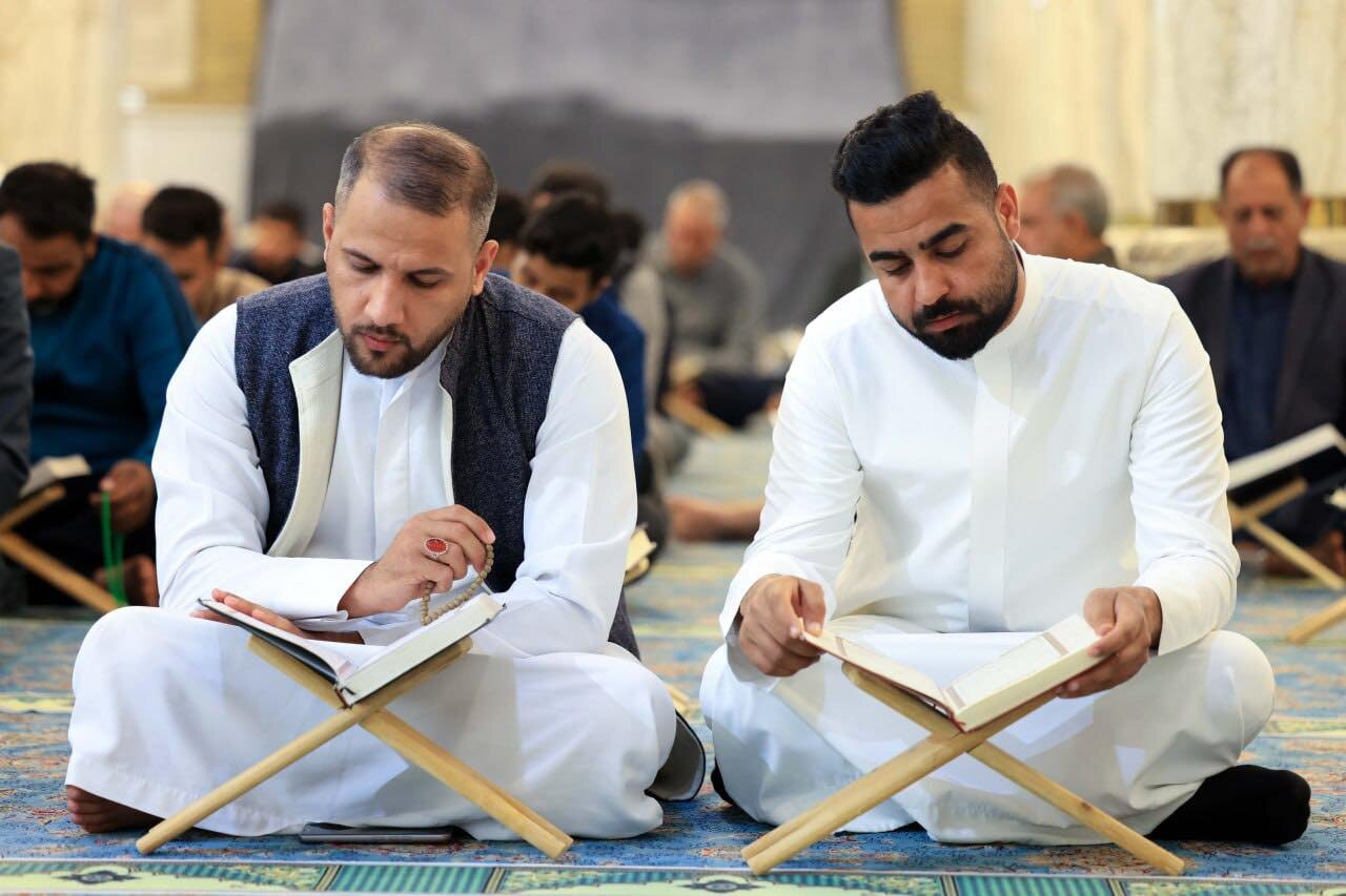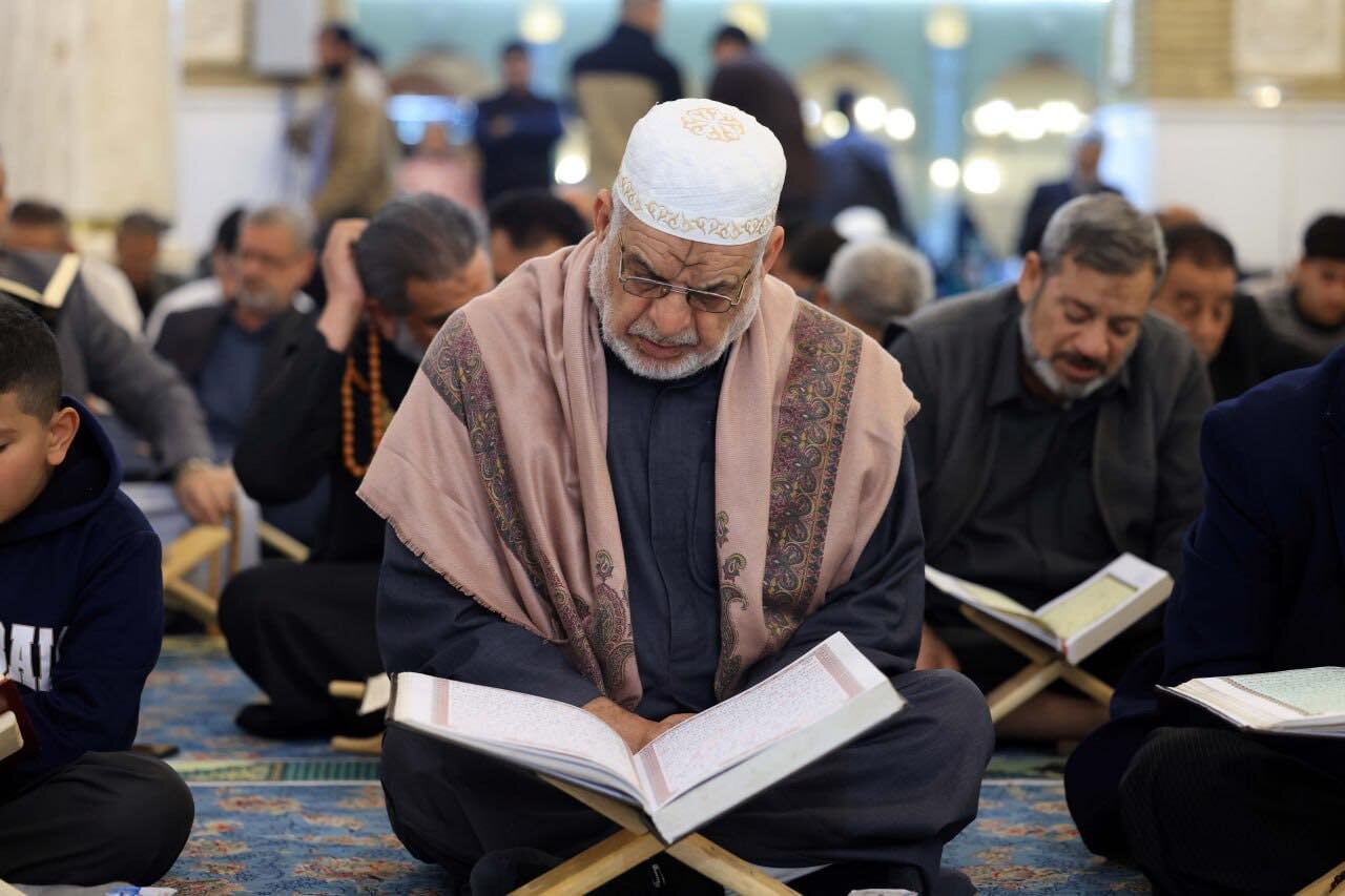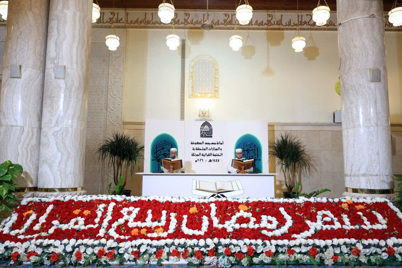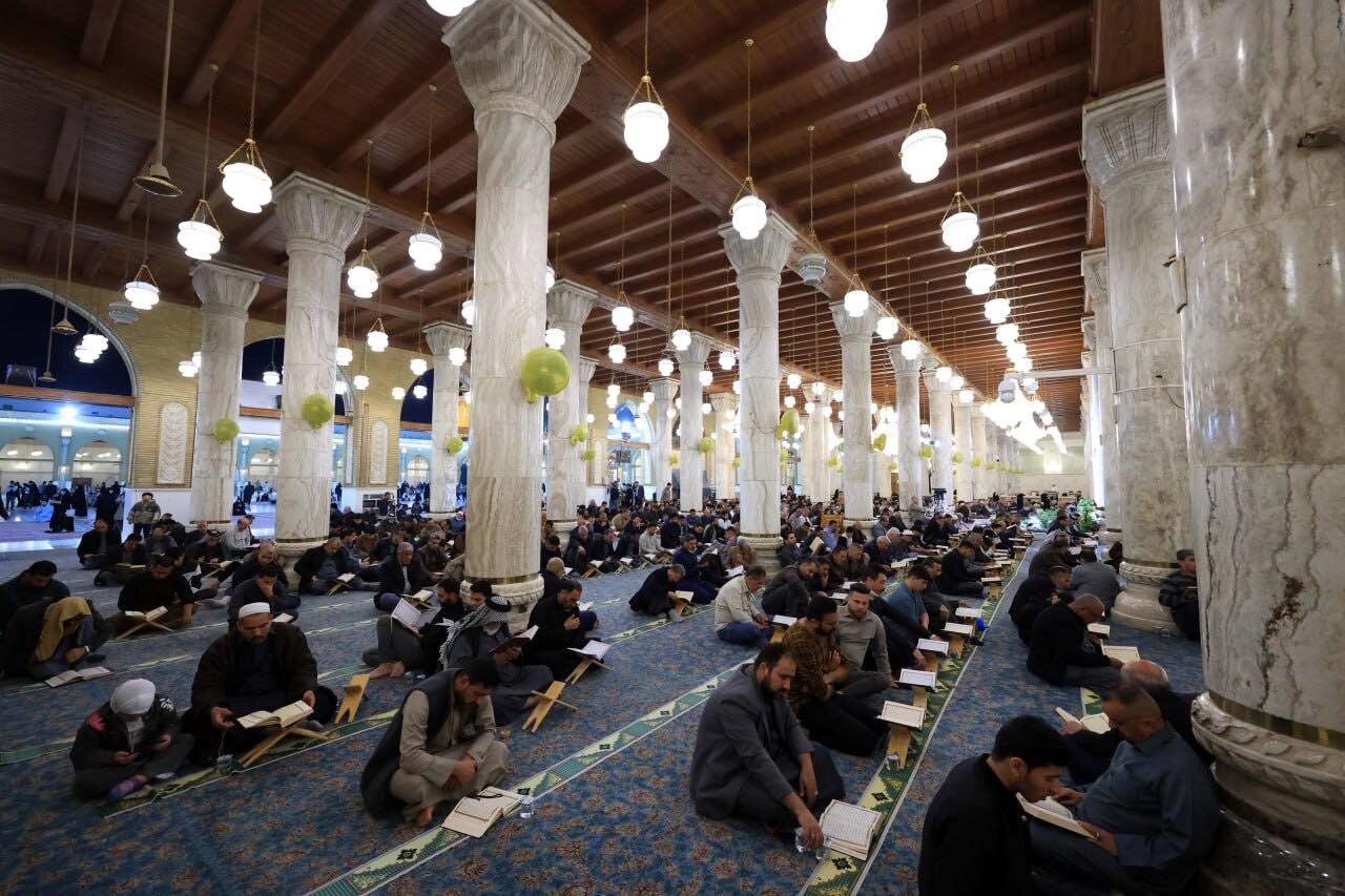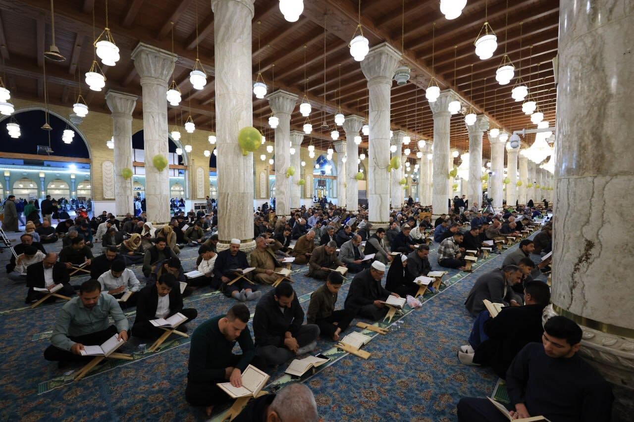 At the Grand Mosque of Kufa, worshippers gather in a serene spiritual atmosphere where Qur’anic recitation fills the space with light. The verses elevate hearts and deepen the connection of believers to the Holy Qur’an.
