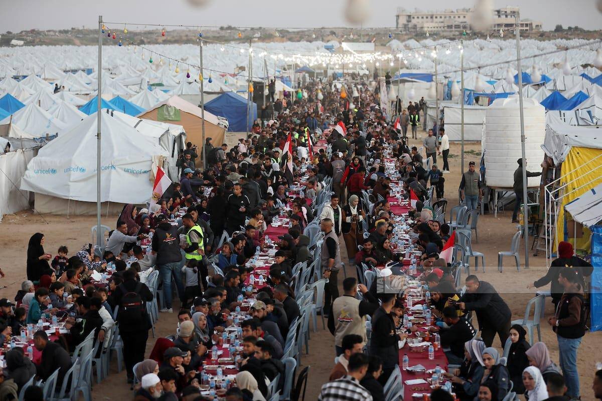 Displaced Palestinians in the city of Al-Zahra, central Gaza, gathered for a communal iftar on the fourth day of Ramadan month. Families and children shared a simple meal inside a shelter camp, reflecting both the hardship of displacement and the spirit of solidarity during the holy month.