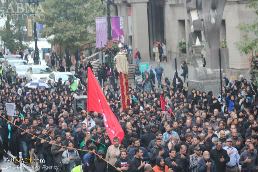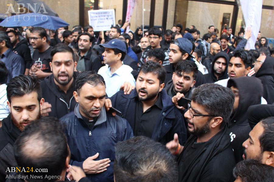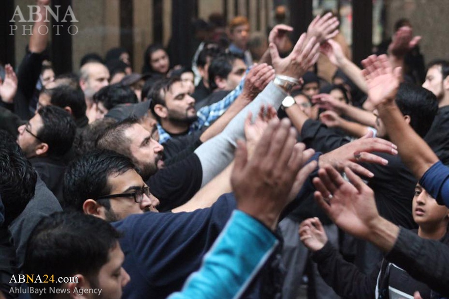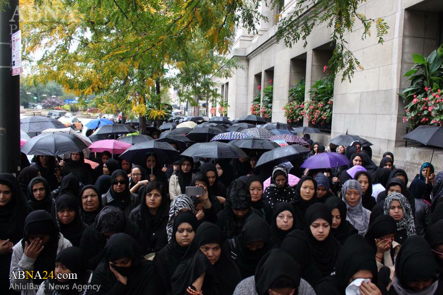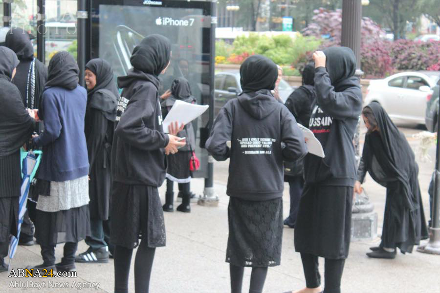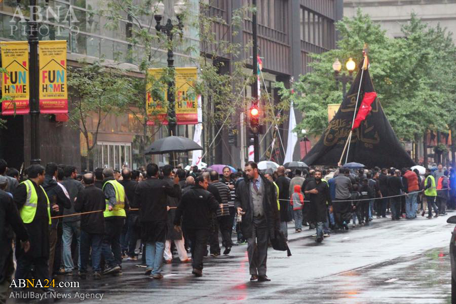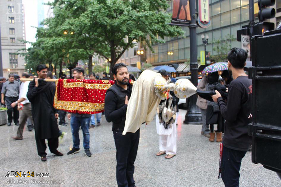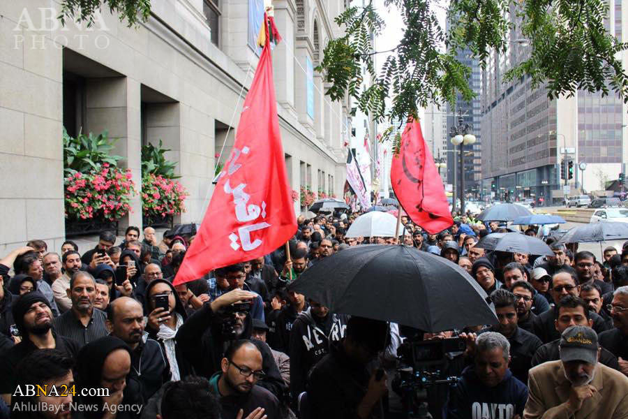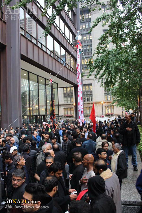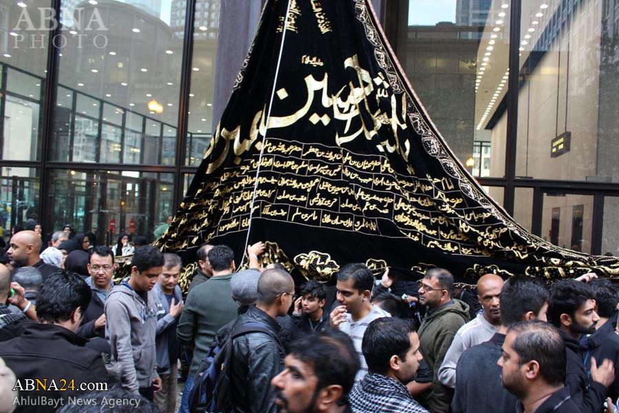 Ashura procession in Chicago, U.S.1438-2016. *** Imam Hussein and his companions were martyred on Ashura, the 10th day of Muharram (Lunar month), which falls on 12th October 2016 this year. Muharram ceremonies symbolize the eternal and unwavering stance of truth against falsehood and humanity’s struggle against tyranny, the cause for which Imam Hussein was martyred.
